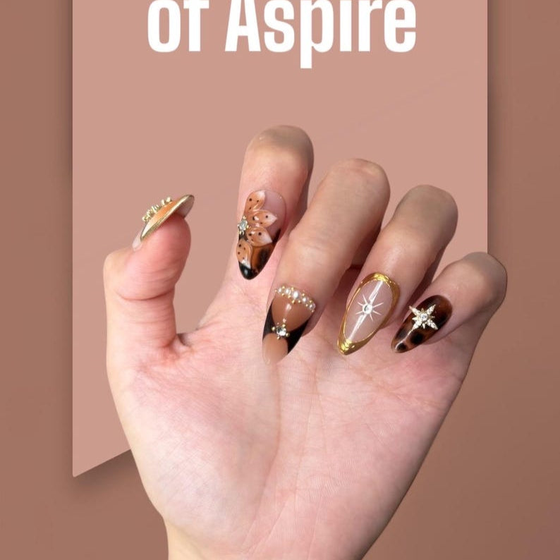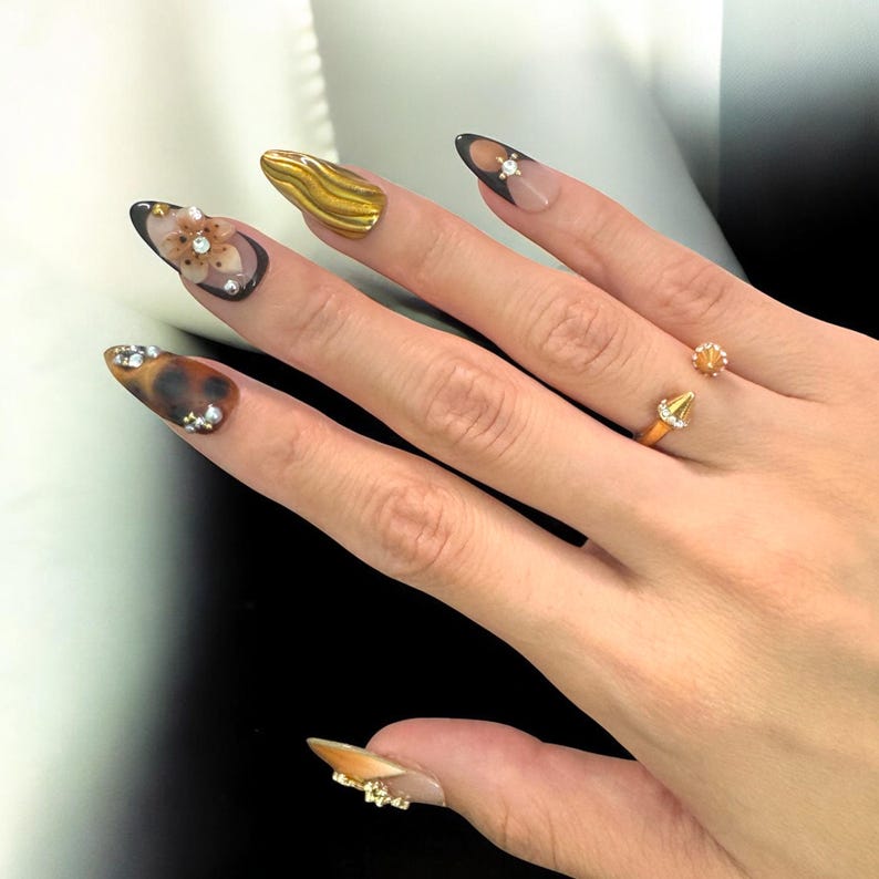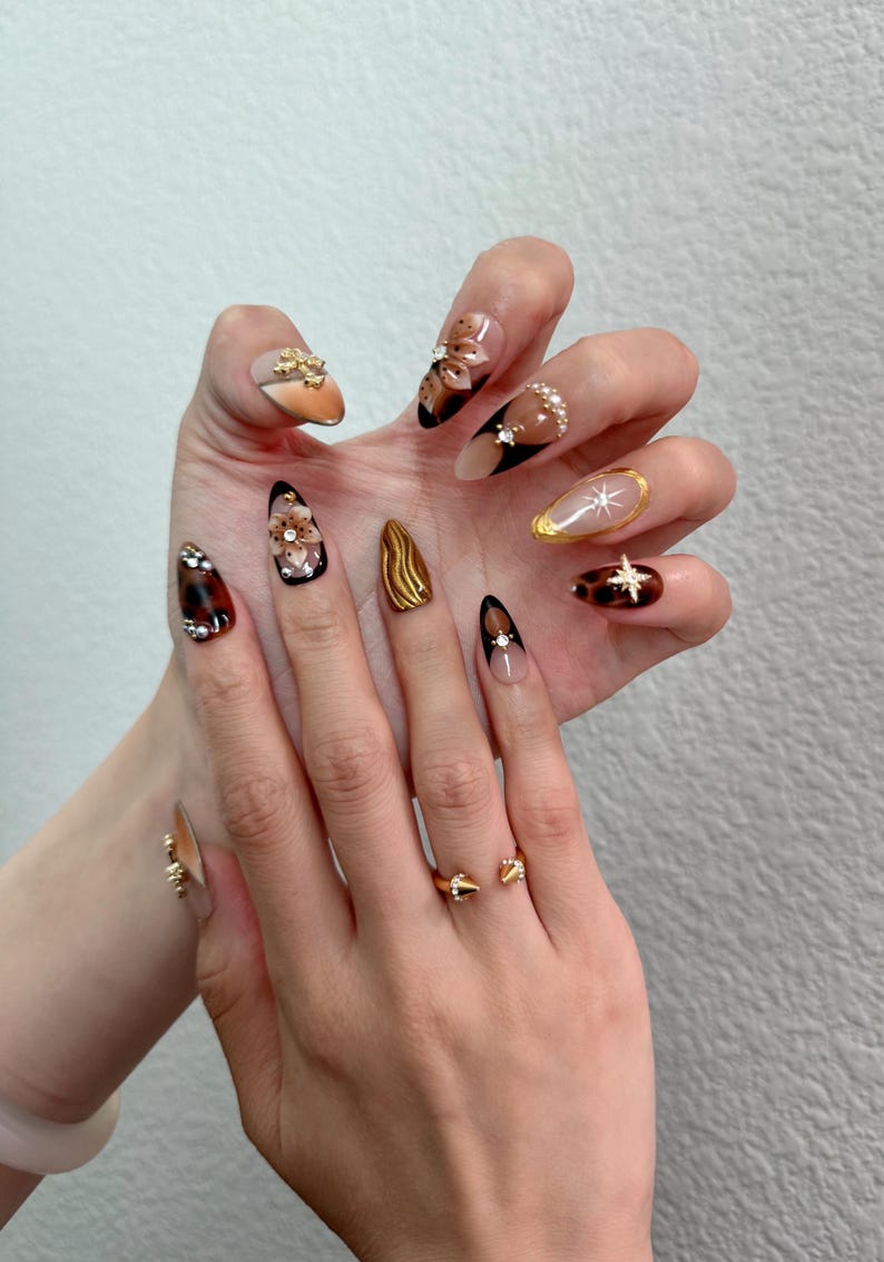 Brown Autumn Flowers Chrome Nails with Cross and Pearls Hexagram Medium Almond Luxury Salon-quality Reusable Handmade Press-on Nails