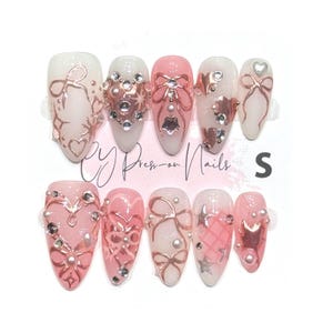 3D Heart with Bows Party Birthday Nails All Use Premium Fake Nails Medium Almond Salon-quality Reusable Handmade Press-on Nails