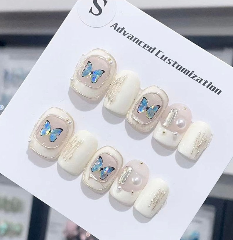 Baroque Blue Butterflies Extra Short Square Nails Work-friendly