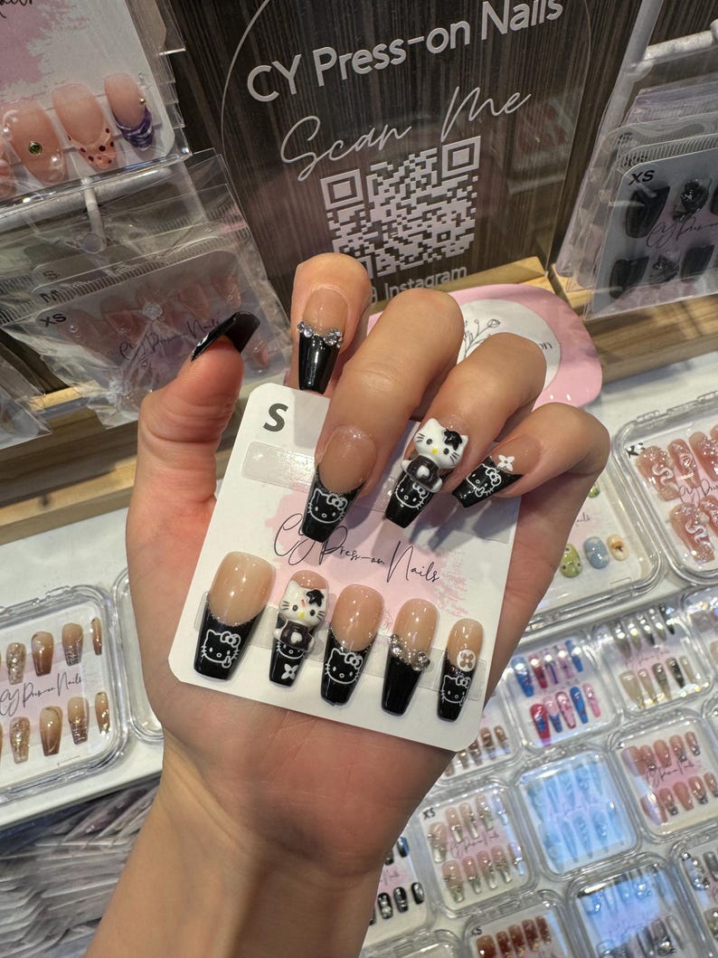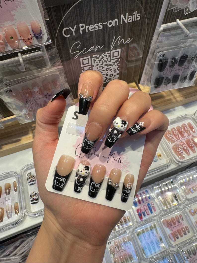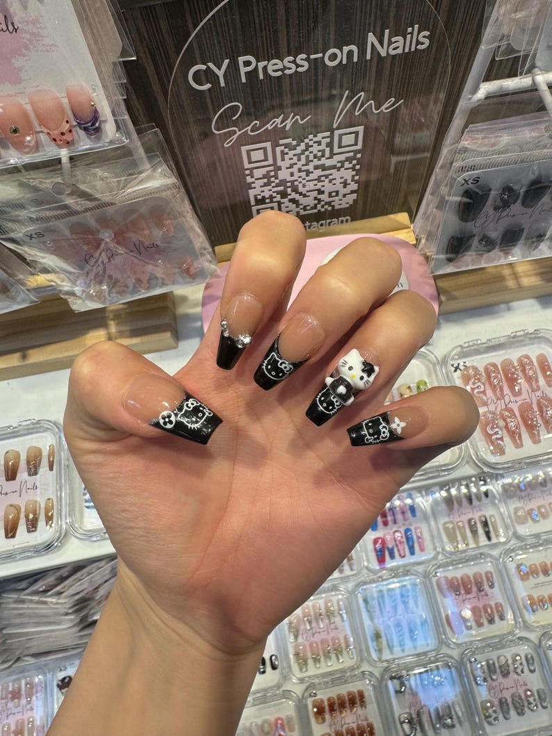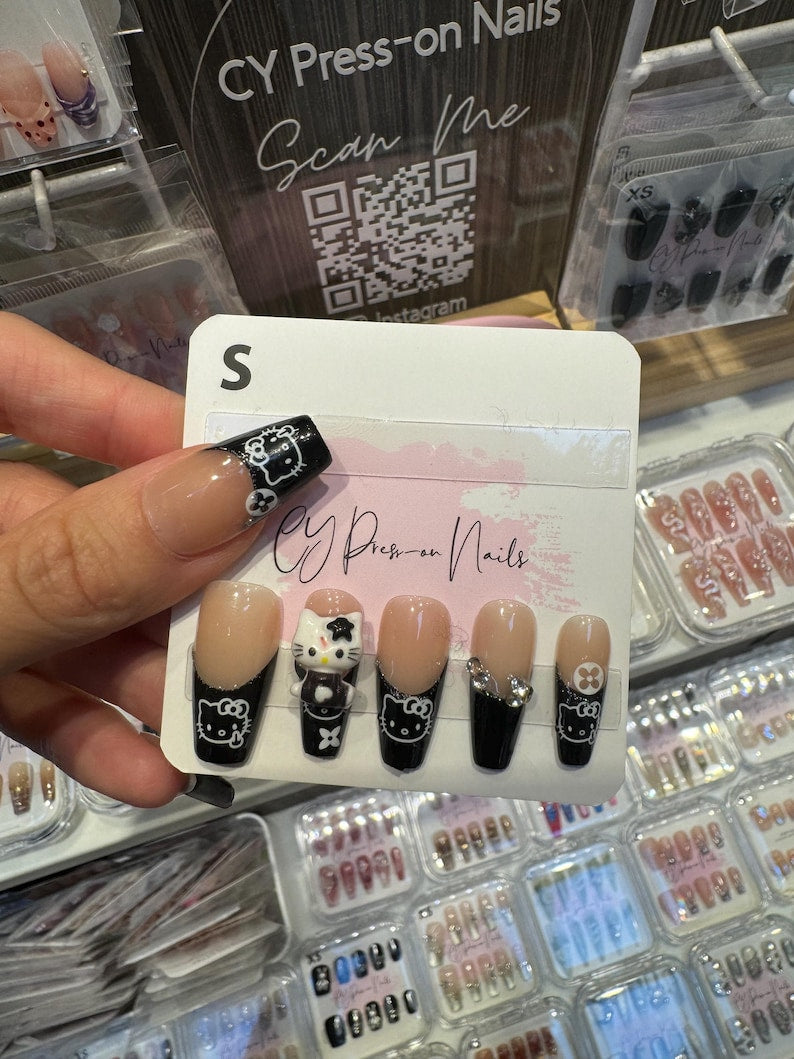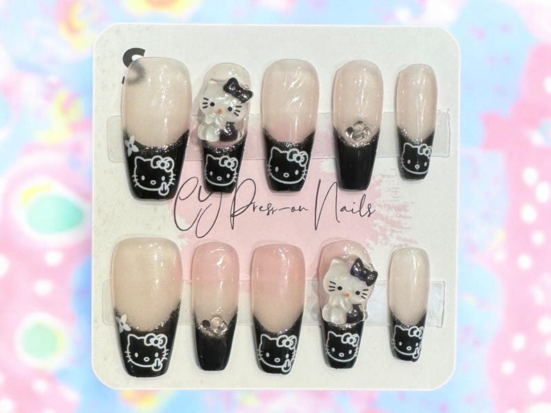 Black Hello Kitty French Tips with Charms Medium Coffin-shape Salon-quality Reusable Handmade Press-on Nails