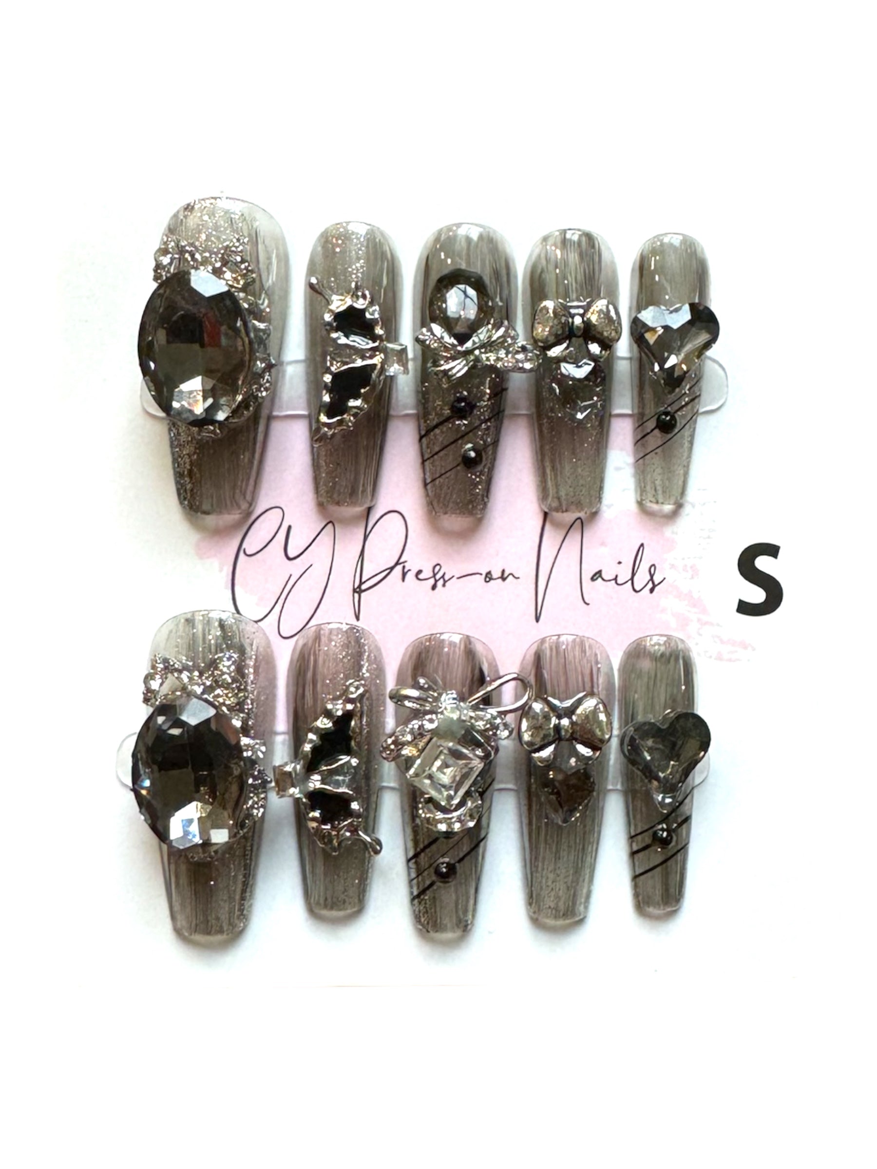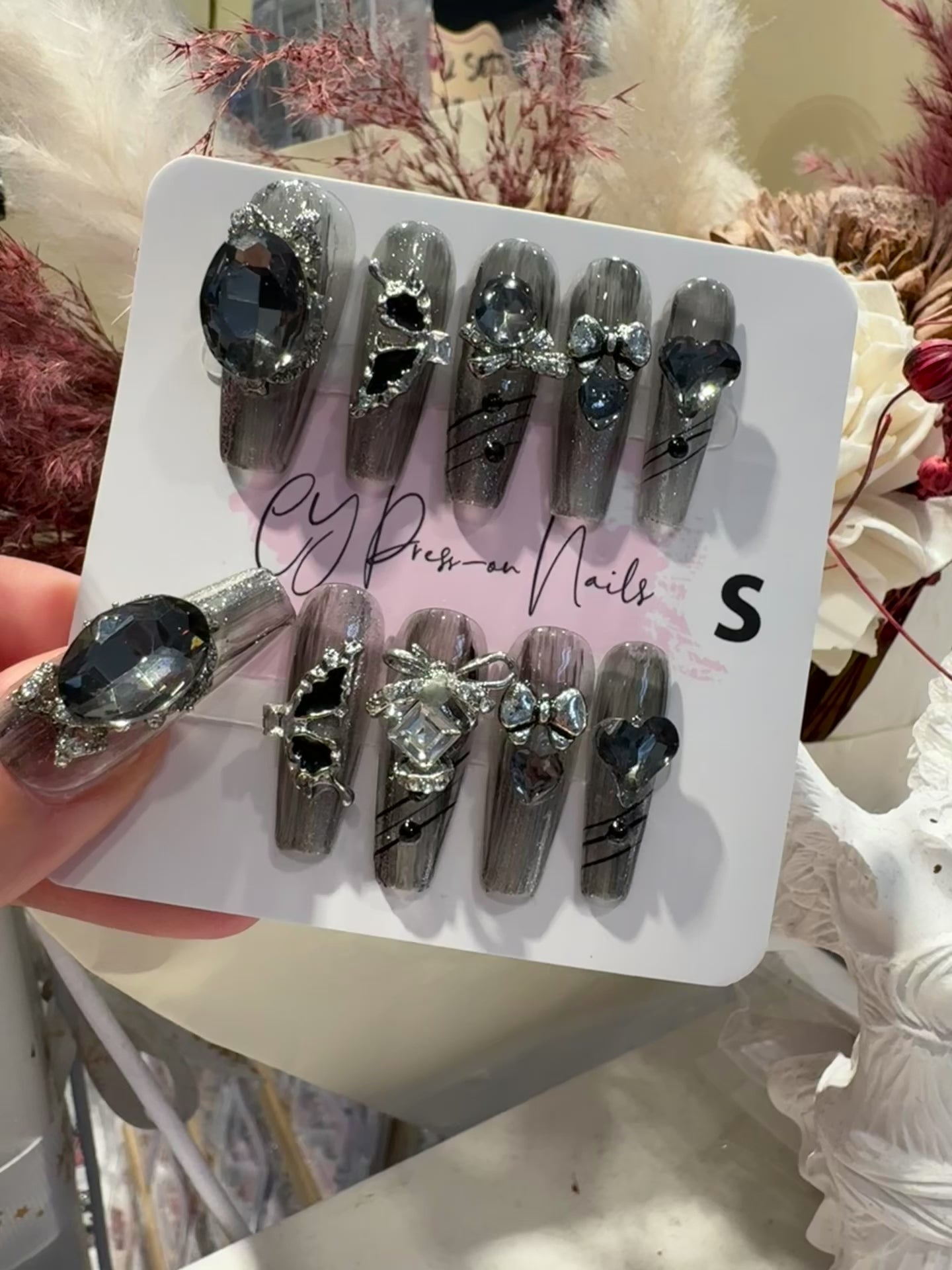 Black Grey Dark Butterfly 3D Nails with Big Gem Charms Bow Heart