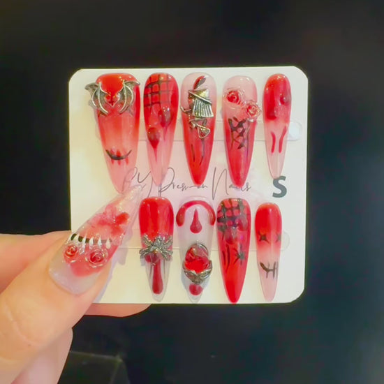 Long Red Ombre Painting Halloween Nails with 3D Bat Skull Roses Butterfly Charms