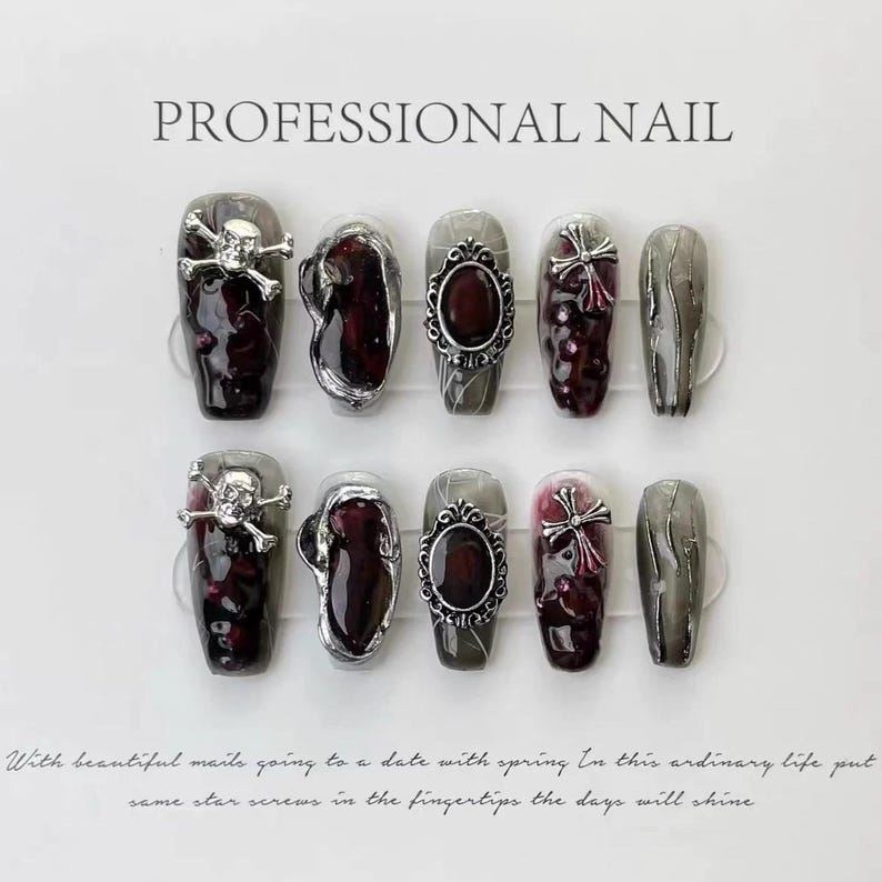 Halloween Nails Burgundy Wine Dark Red Medium Coffin Salon-quality Reusable Handmade Press-on Nails Easy to Apply DIY Nails