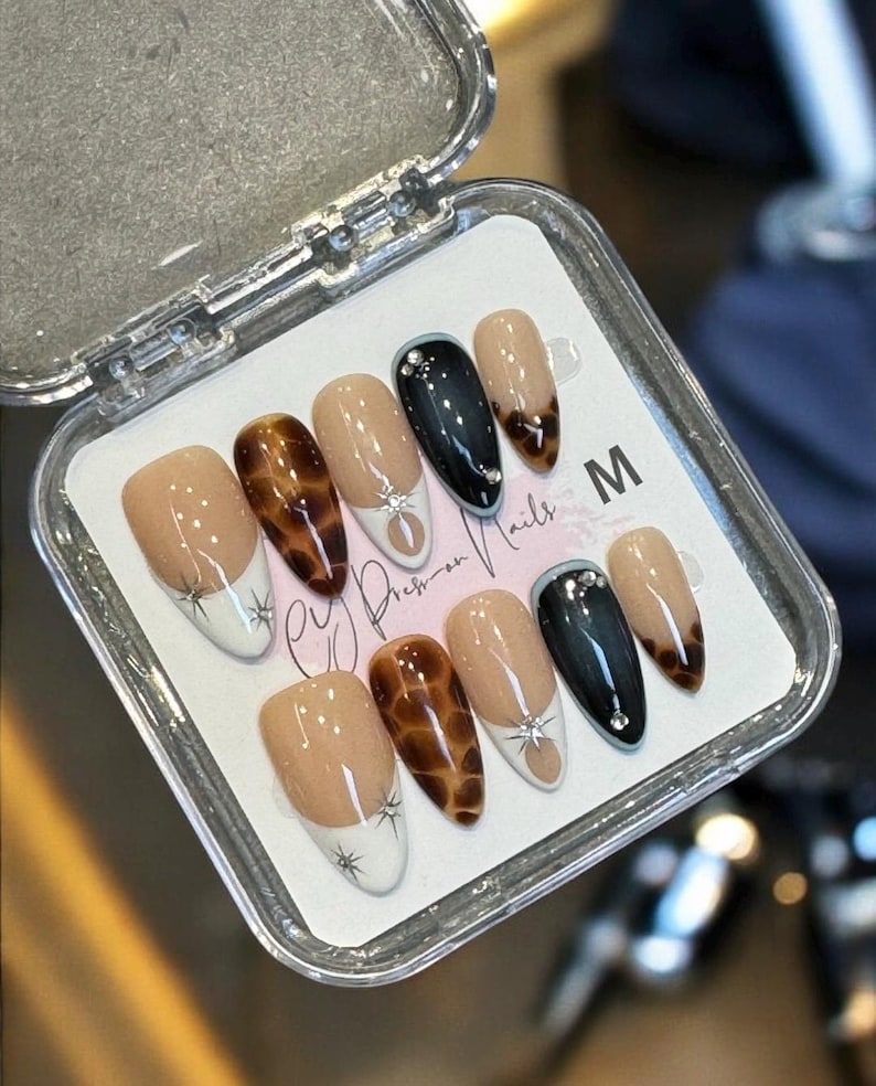 Brown Silver Star Blue Crystal Autumn Dark Medium Almond Nails Premium Salon-quality Reusable Handmade Press-on Nails Easy Use Fake Nails