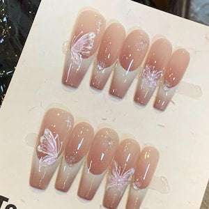Nude Pink Ombre French Tips Hand-painting Coffin Salon-quality Reusable Handmade Press-on Nails | DIY Free Glue Kit