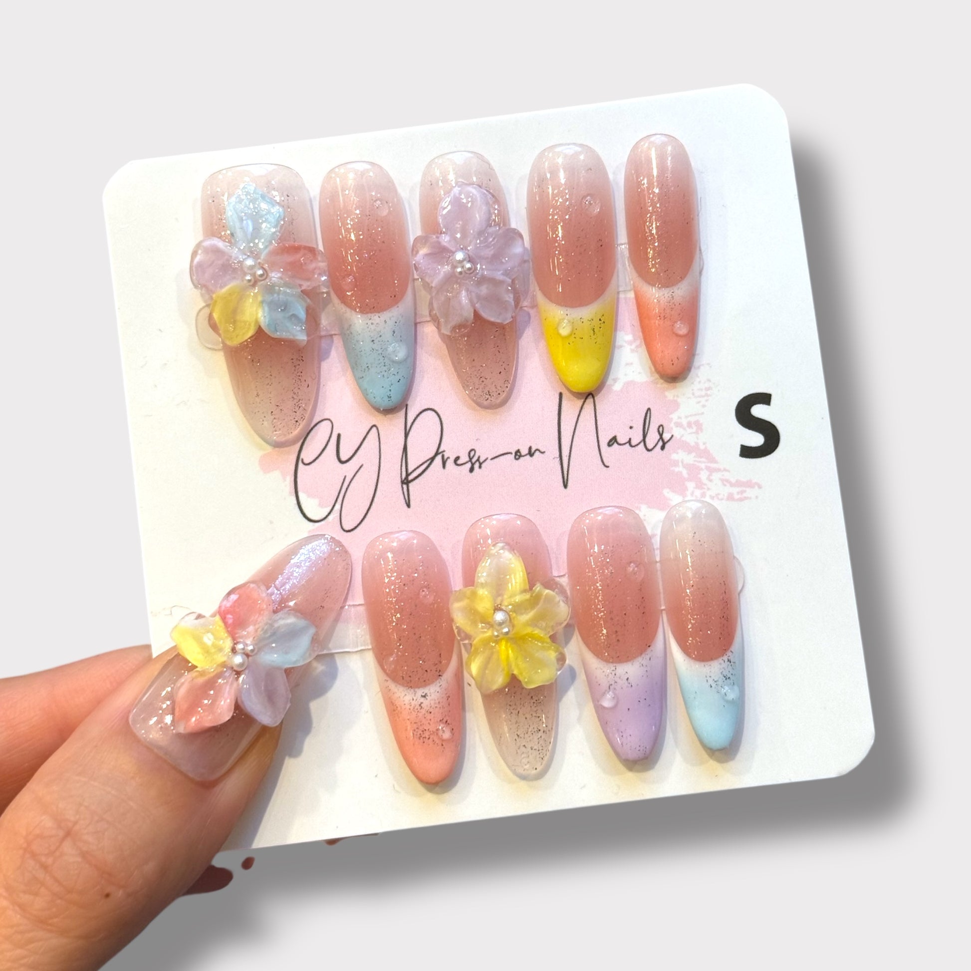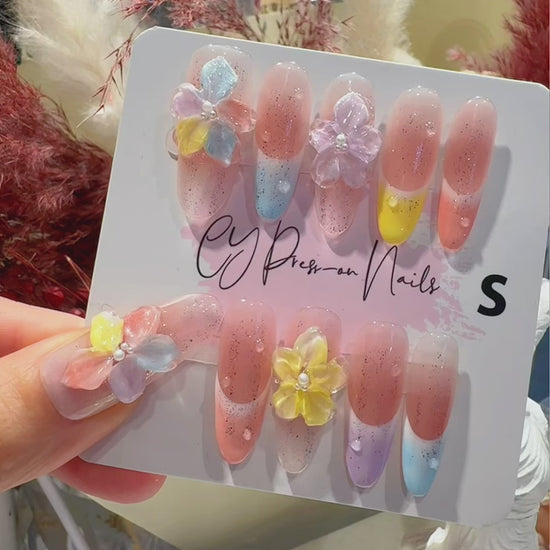 Sweet, soft, and full of charm — our Candy Bloom press-on nails blend pastel ombré shades of pink, lilac, blue, and yellow for a dreamy, candy-inspired look. Adorned with 3D floral charms and delicate pearl centers, this handmade set captures the essence of springtime beauty. Ideal for brunch dates, vacations, or everyday sweetness, these nails add a playful yet elegant touch to any outfit.