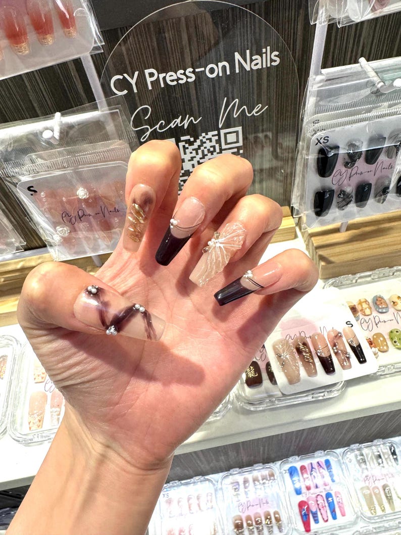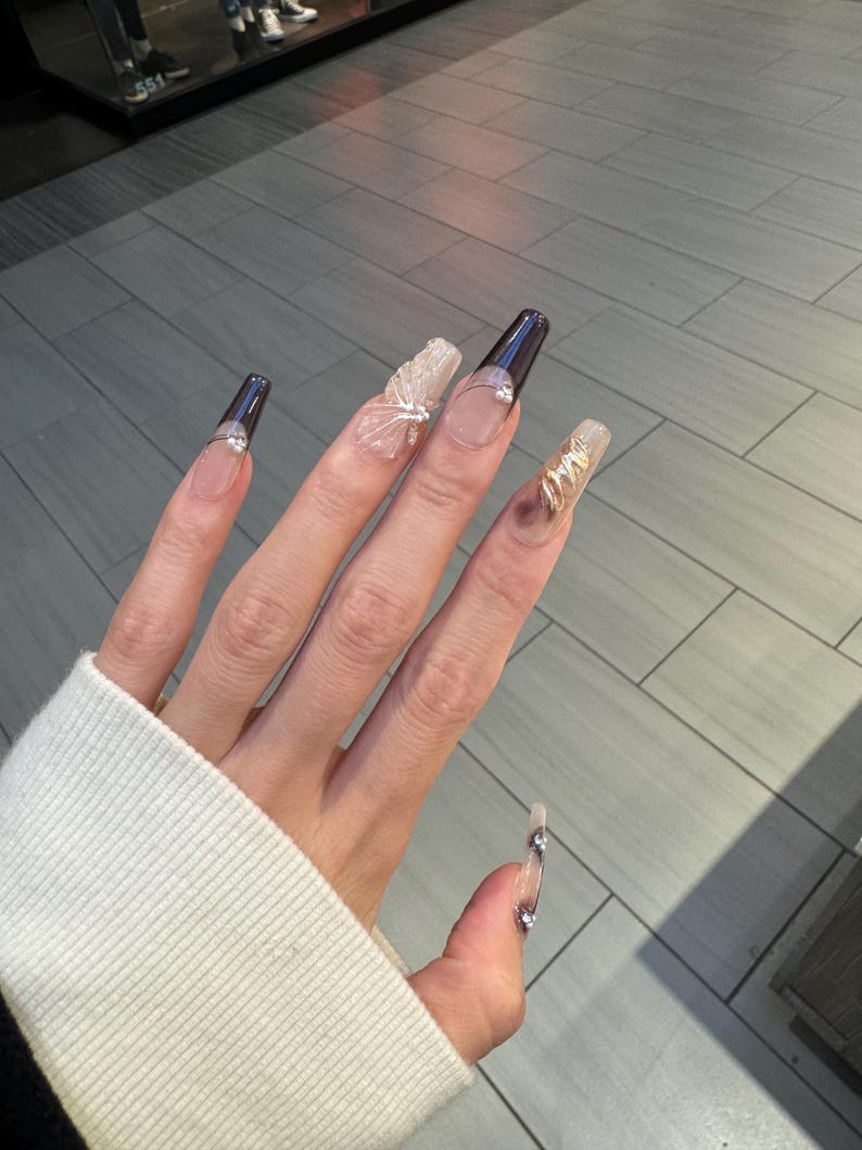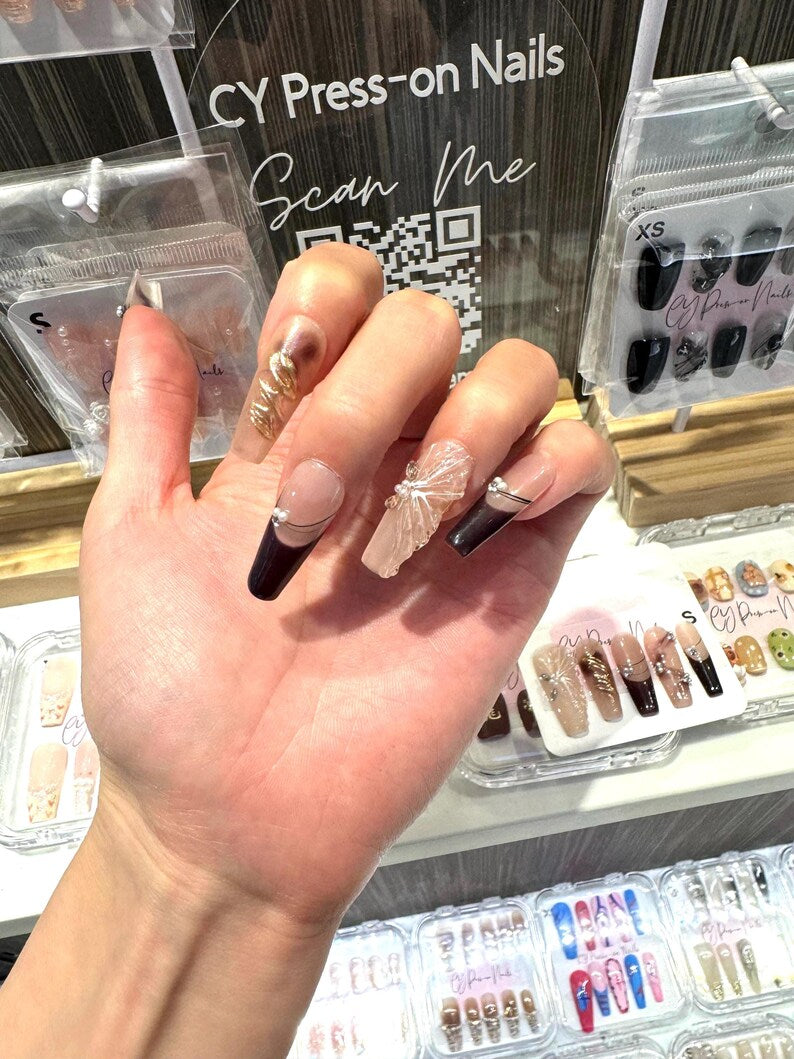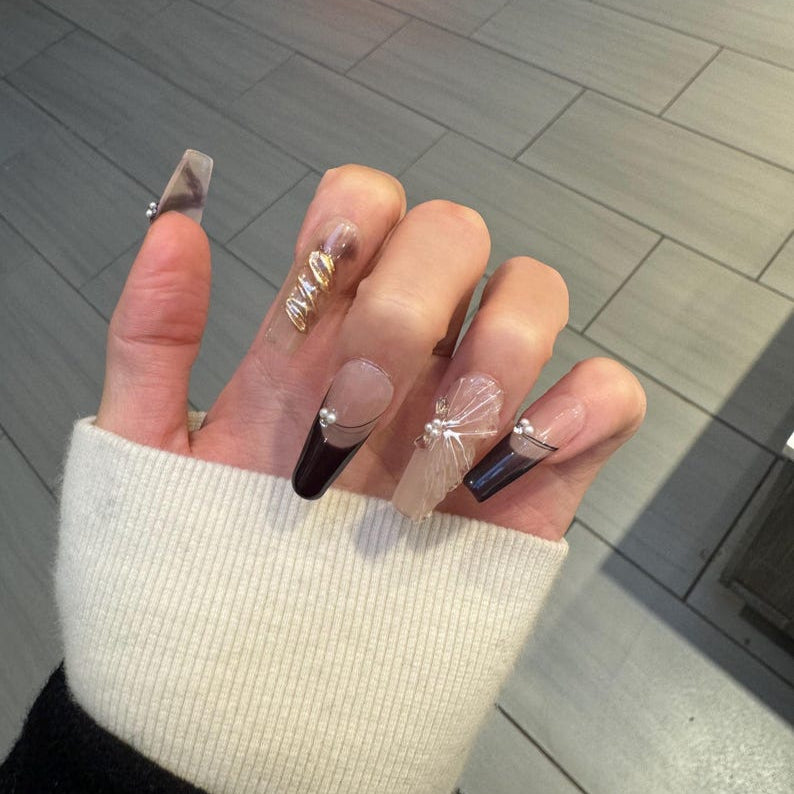Caramel Dark Brown Long Coffin Nails Silk Butterflies with Pearls Nails French Tips Salon-quality Reusable Handmade Press-on Nails