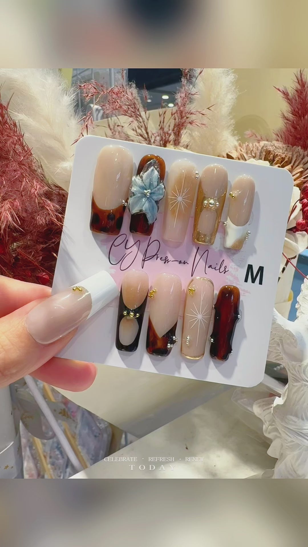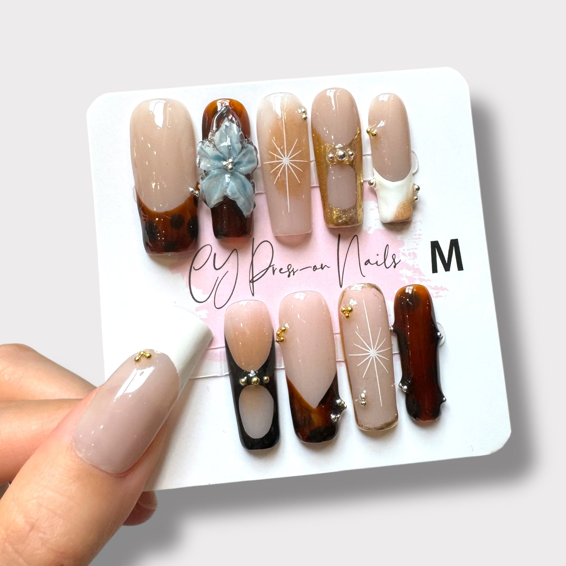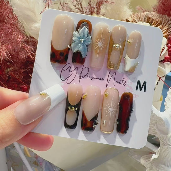 Elegant and timeless, the Caramel Glow press-on nail set features a warm mix of nude beige, ivory white, and tortoiseshell brown tones. Accented with gold foils, crystal studs, and a soft 3D floral charm, this handmade design exudes modern sophistication. The glossy finish and starburst details add a subtle sparkle, perfect for everyday wear, office chic, or fall-inspired looks.