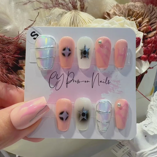 This elegant press-on nail set features a dreamy mix of soft pink and iridescent chrome finishes. The design includes pearlescent aurora nails with silver foil borders, creating a mirror-like effect that shifts between pastel rainbow hues. Accent nails showcase dimensional black star studs on peachy pink and creamy beige bases, while delicate silver rhinestones add subtle sparkle. The palette combines milky pinks, nude tones, and holographic shimmer for a celestial, feminine aesthetic that’s perfect for those who love ethereal, space-inspired nail art with a romantic touch.