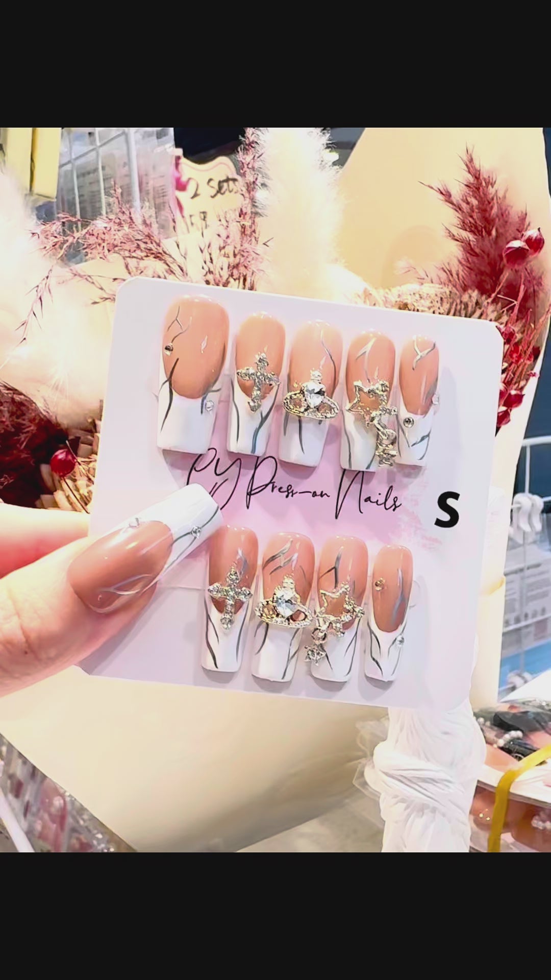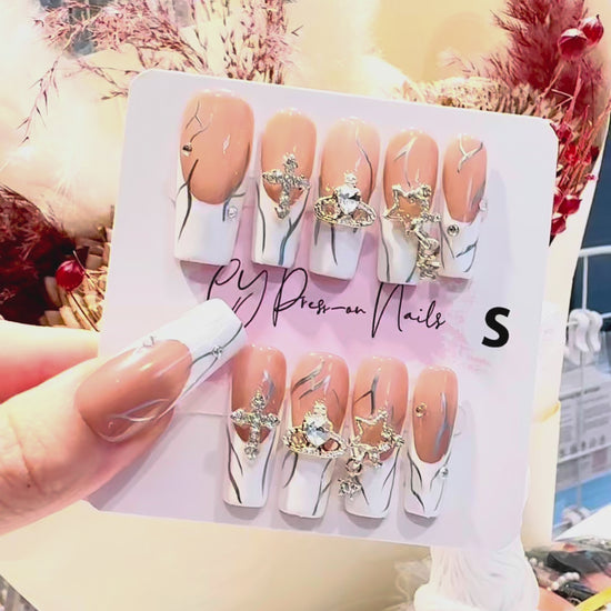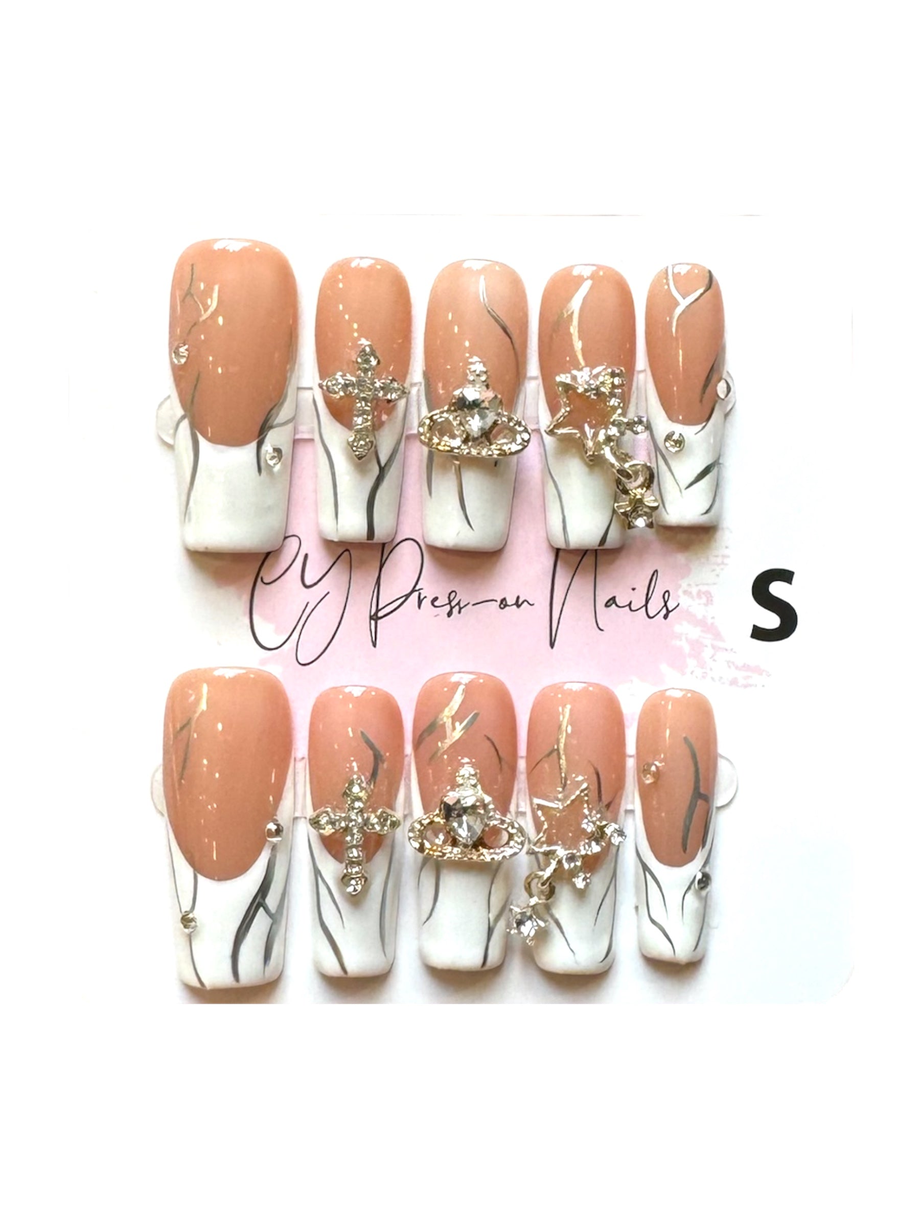 Elegant and divine — Celestial Marble features a nude pink and white marble design with silver accents and crystal charms. Adorned with 3D crosses, stars, and crown-inspired gems, this set radiates a balance of grace and glam. Perfect for chic events, bridal looks, or anyone who loves celestial luxury in their manicure.