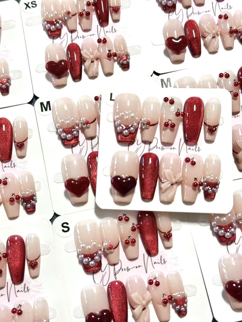 Cherry Obessed Heart Red Nails with Pearls Cat Eye Medium Coffin Nails with Bows Reusable Salon-quality Handmade Press-on Nails