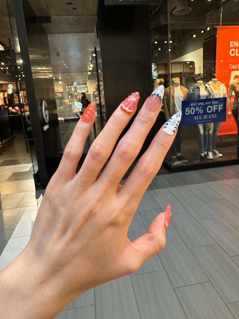 Fanta Blue 3D Floral Orange Tangerine Fruit Soda Blue and White Porcelain Print Medium Almond Salon-quality Reusable Handmade Press-on Nails