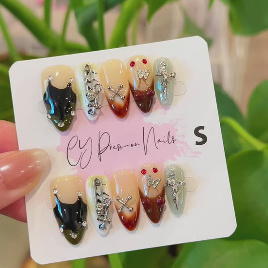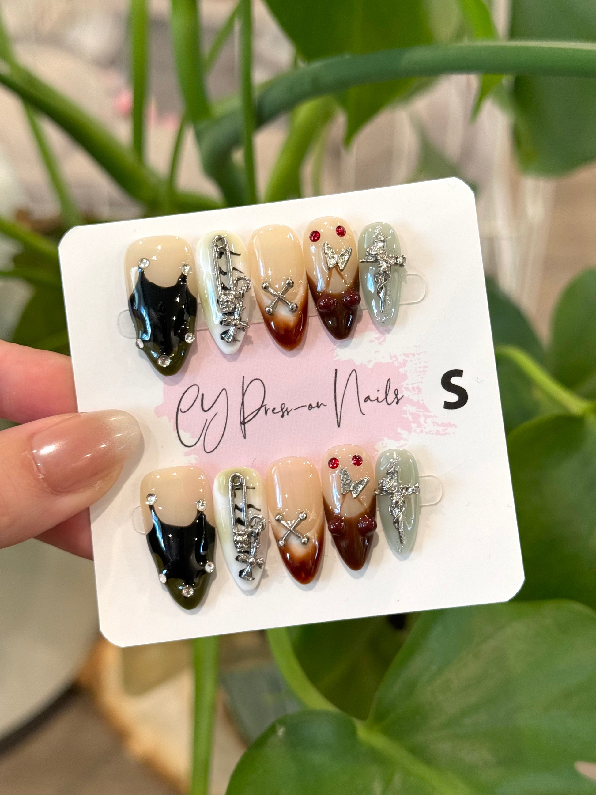 A bold fusion of gothic edge and vintage elegance. This handmade press-on nail set features a rich nude base layered with smoky black, amber brown, and muted sage tones, finished with sculptural silver metal accents and crystal details. Each nail is individually designed to feel like a wearable artifact—dark, refined, and unapologetically unique.