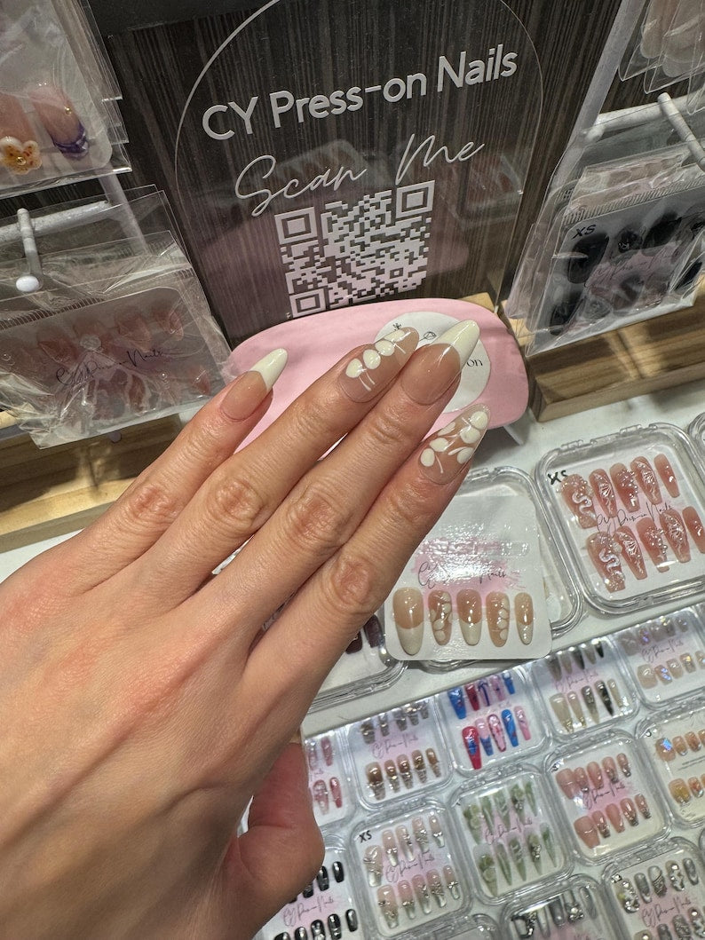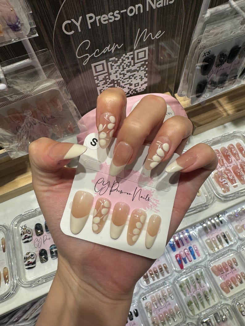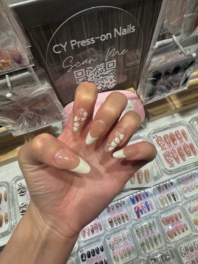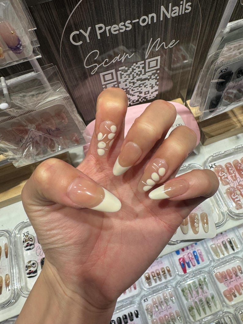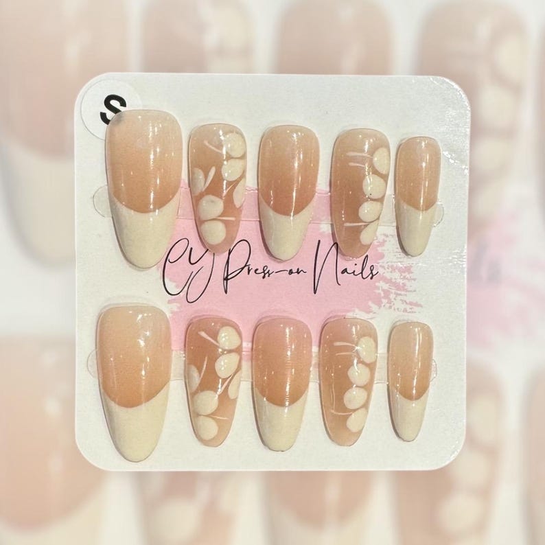 Hand-painting White French tips with Flowers Medium Oval shape Salon-quality Reusable Handmade Press-on Nails