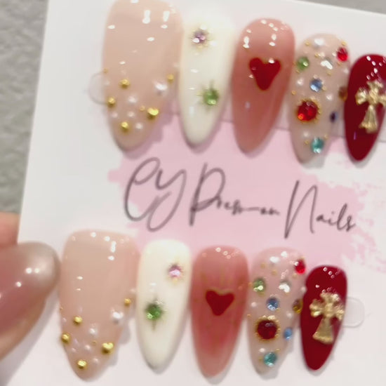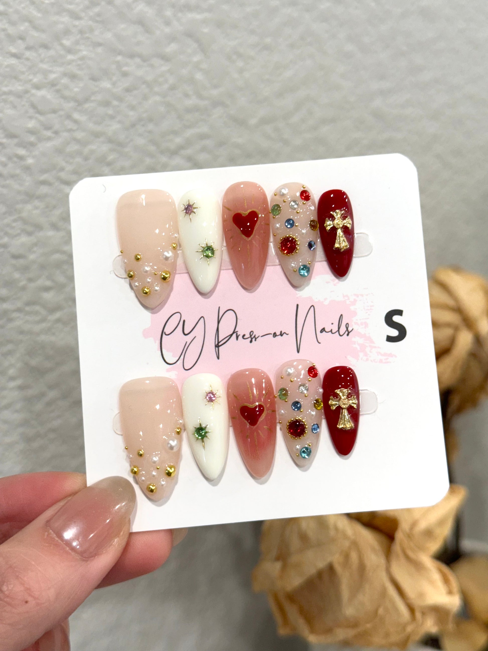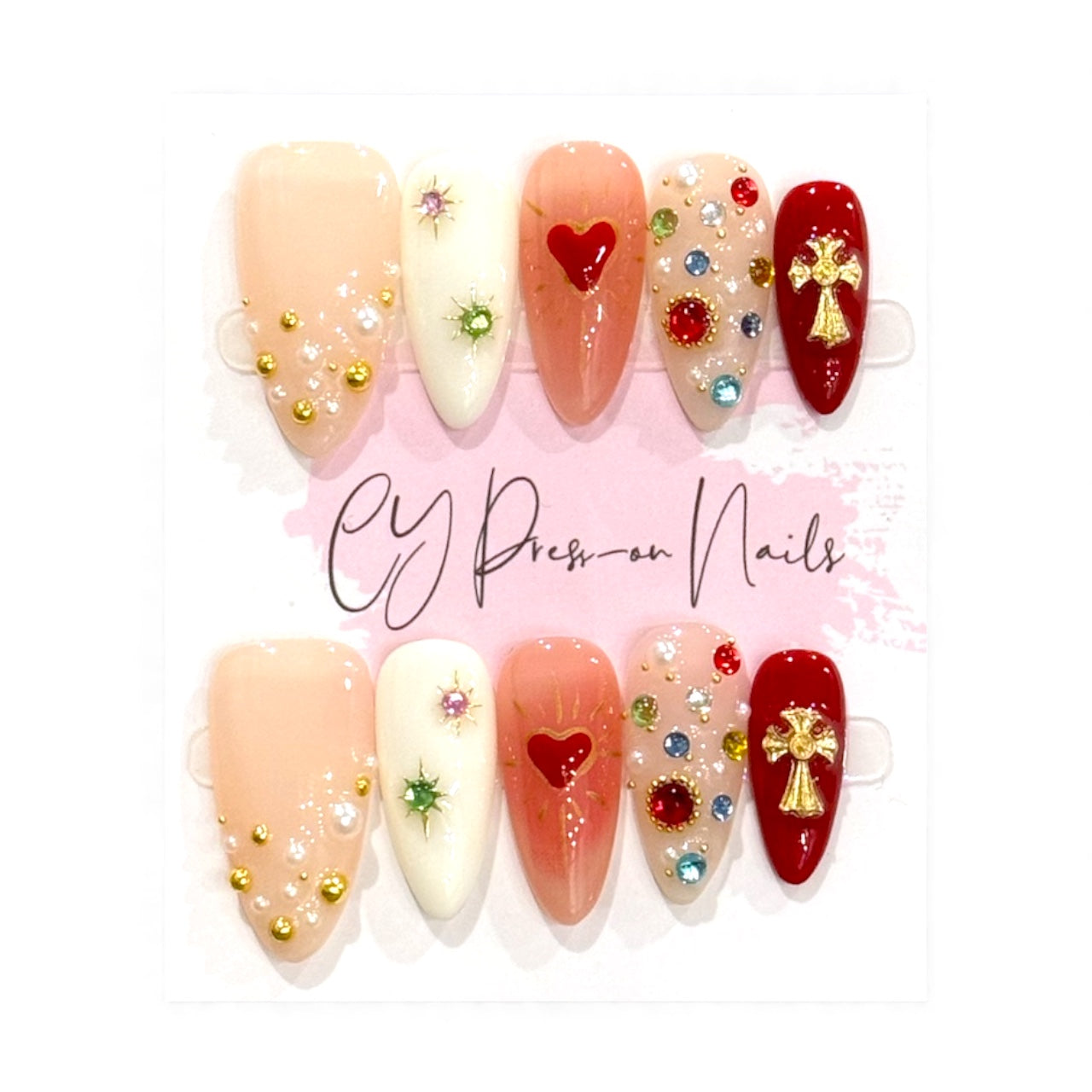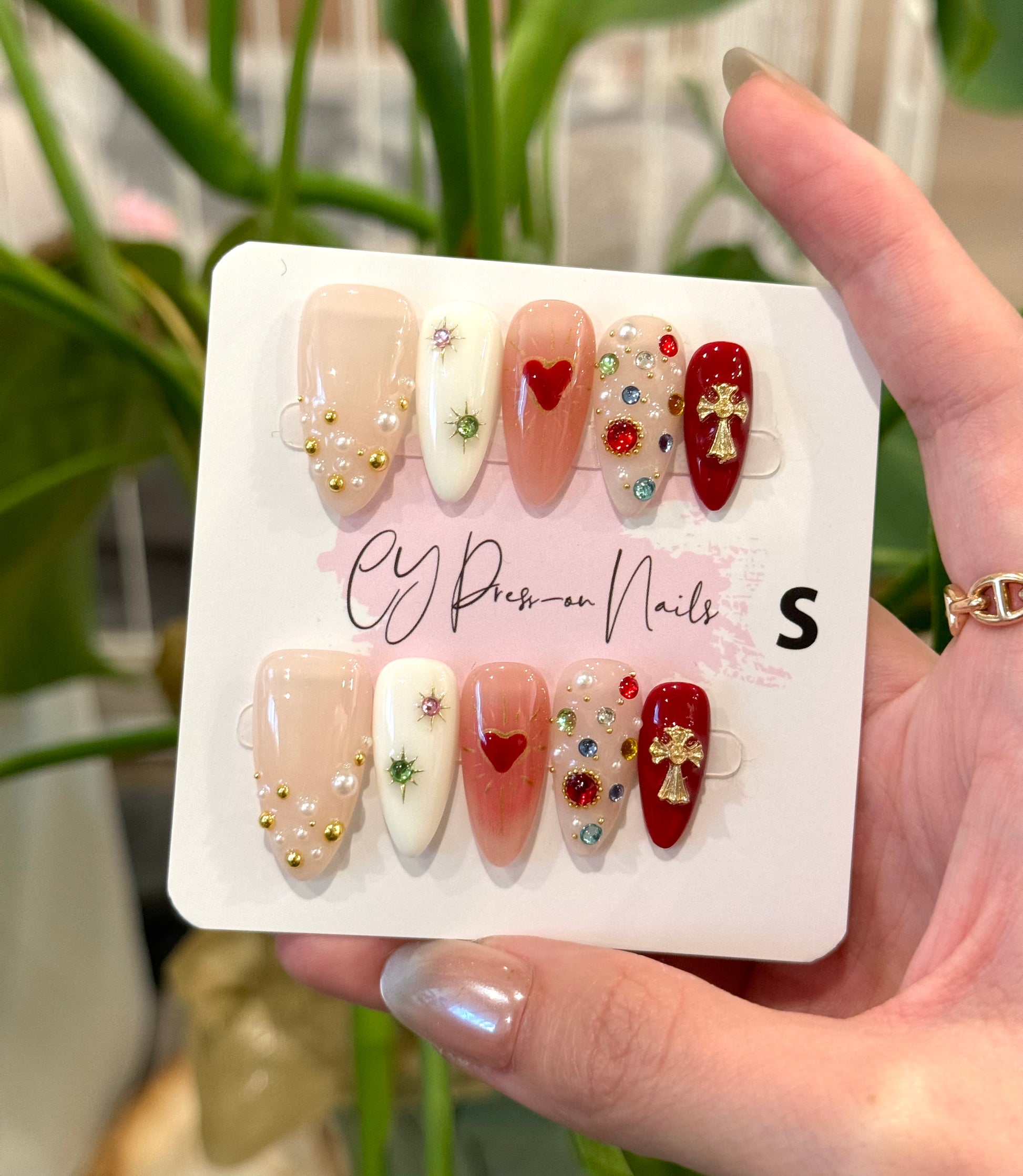 A romantic, statement-making set inspired by sacred motifs and vintage charm. This design blends soft nude and creamy ivory bases with rich crimson accents, featuring hand-placed heart art, radiant crystal studs, and a bold gold cross charm for a striking yet elegant finish. The mix of glossy neutrals and deep red creates a perfect balance of softness and drama.