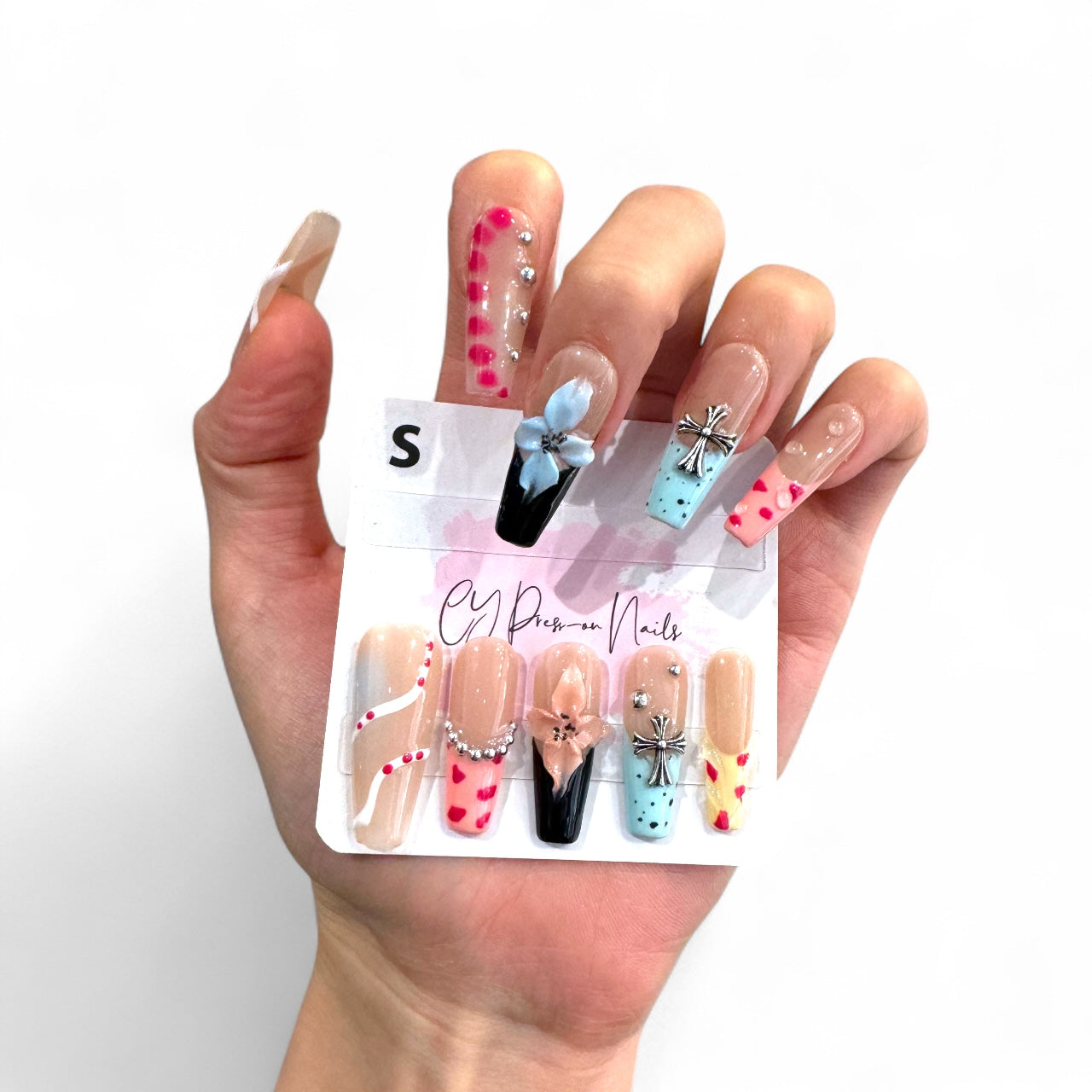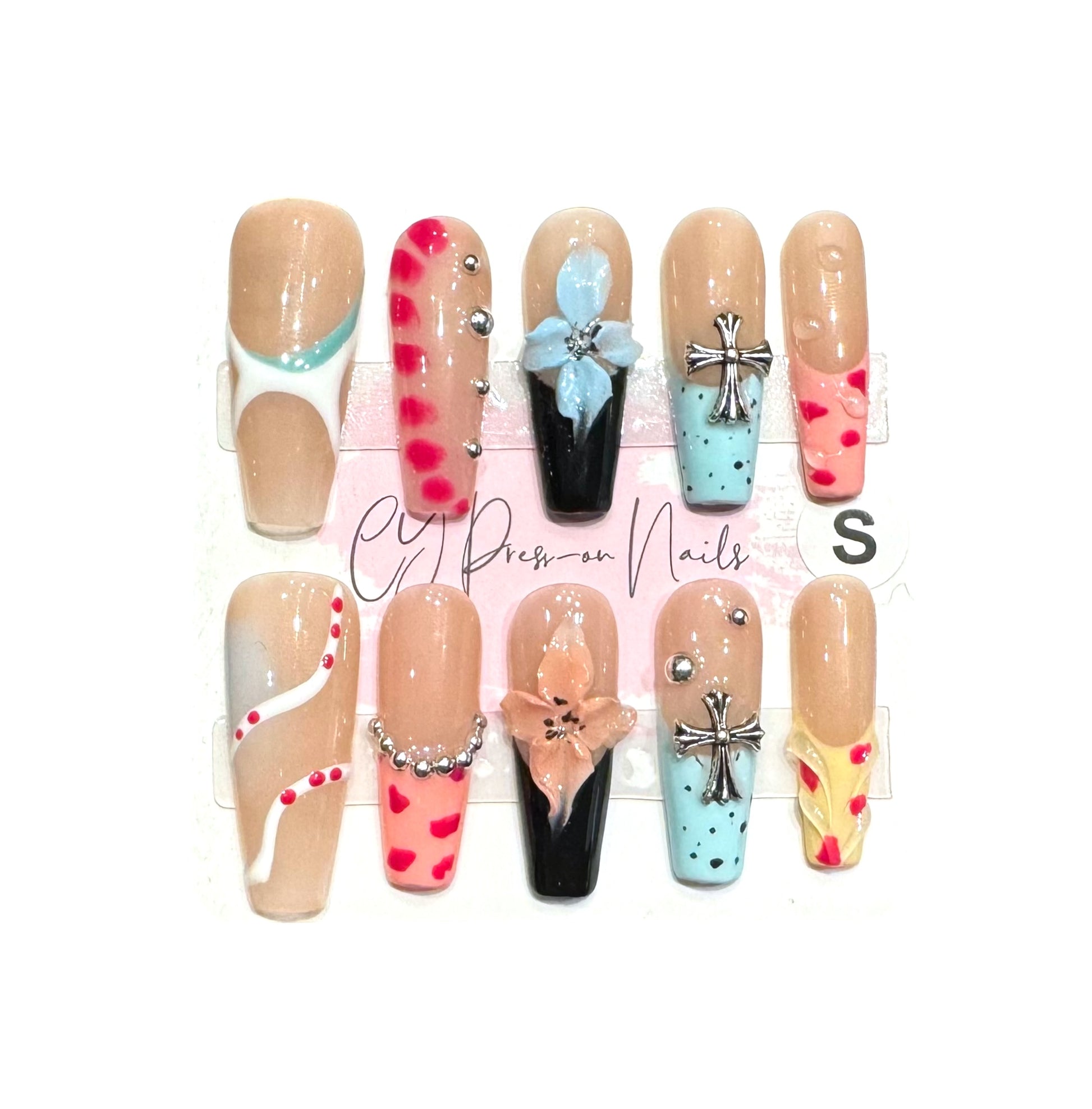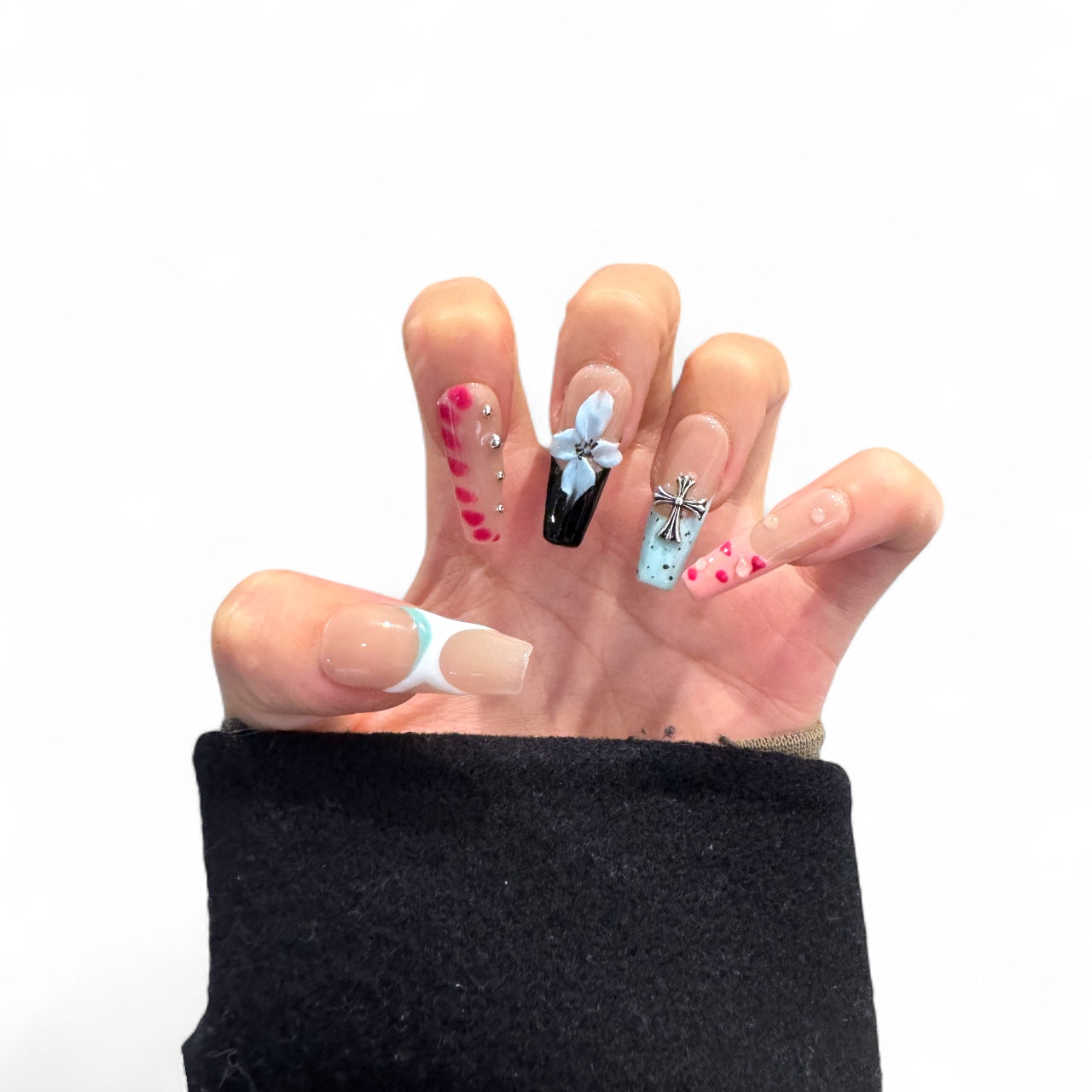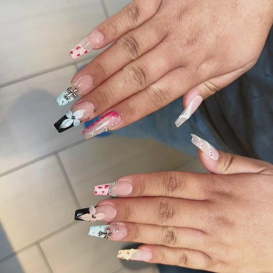 Green Butterflies Nails with Pearls and Crystal Chain Charms Medium Coffin Nails Premium Salon-quality Reusable Handmade Press-on Nails