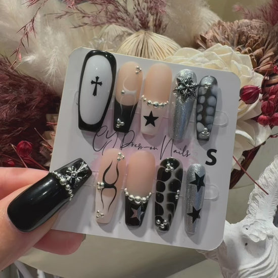 Midnight Rebel handmade press-on nails feature a bold black-and-silver palette with gothic crosses, stars, and edgy chrome accents. The mix of matte nude tones, metallic shimmer, and rhinestone details create a fierce, fashion-forward look perfect for night outs, concerts, or statement styles. Elevate your look with this rock-glam nail design.