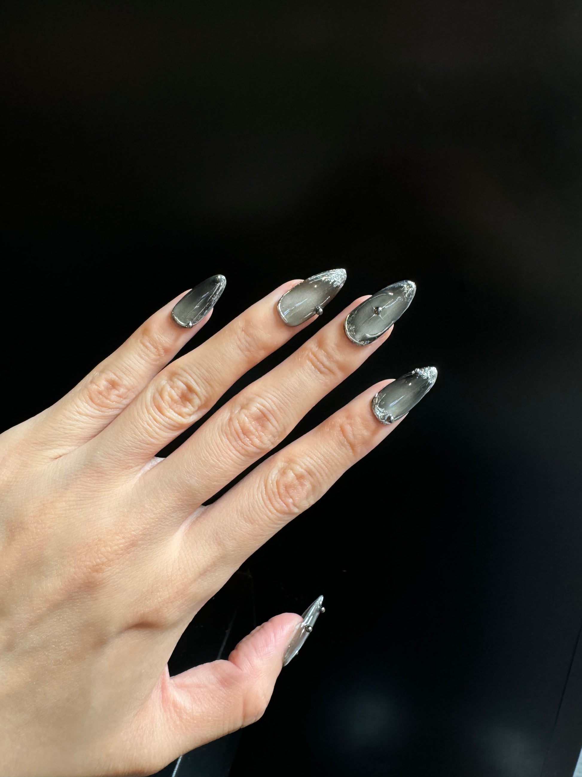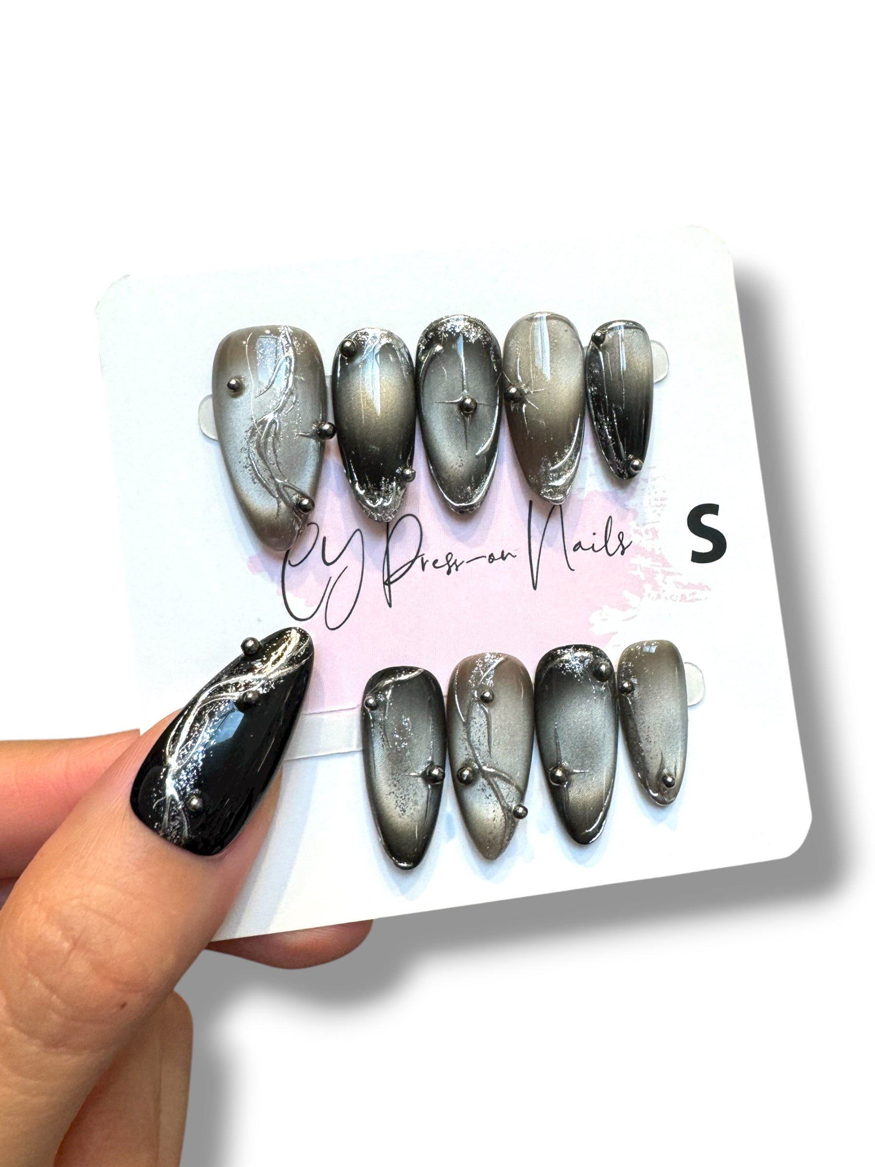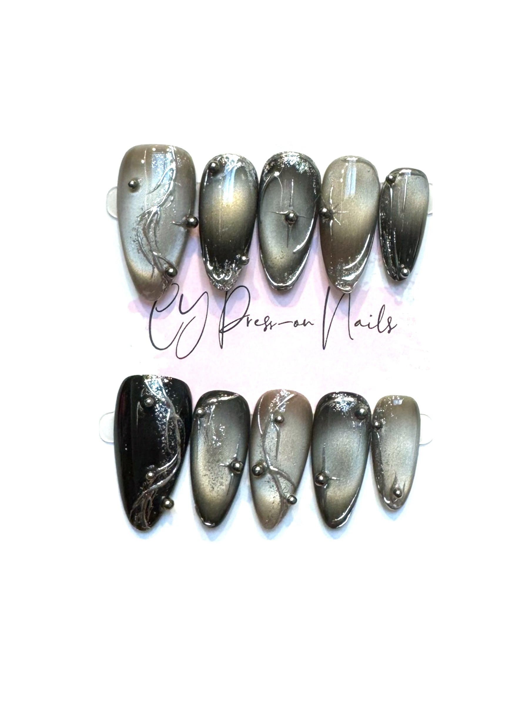 Embrace dark sophistication with our Midnight Shadow press-on nails. Featuring a smooth gradient from deep black to metallic gray, this handmade set is accented with silver shimmer and minimalist chrome studs for a futuristic, edgy look. The subtle cat-eye effect catches light beautifully, making it perfect for evening wear or modern street style. Durable, reusable, and effortlessly elegant — these nails bring a bold statement to every occasion.