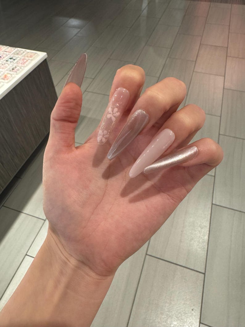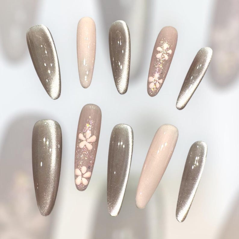 Pink Cat Eye with Little Flowers Extra Long Almond Stitello Premium Salon-quality Reusable Handmade Press-on Nails
