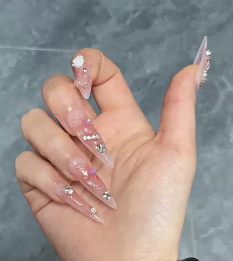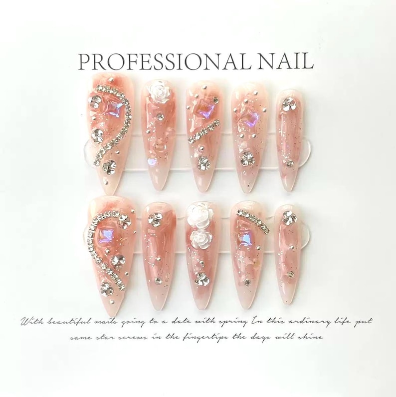 Pink Jelly Peach Cat Eye Nails with Crystals 3D Extra Long Almond Stiletto Pointy Premium Salon-quality Reusable Handmade Press-on Nails