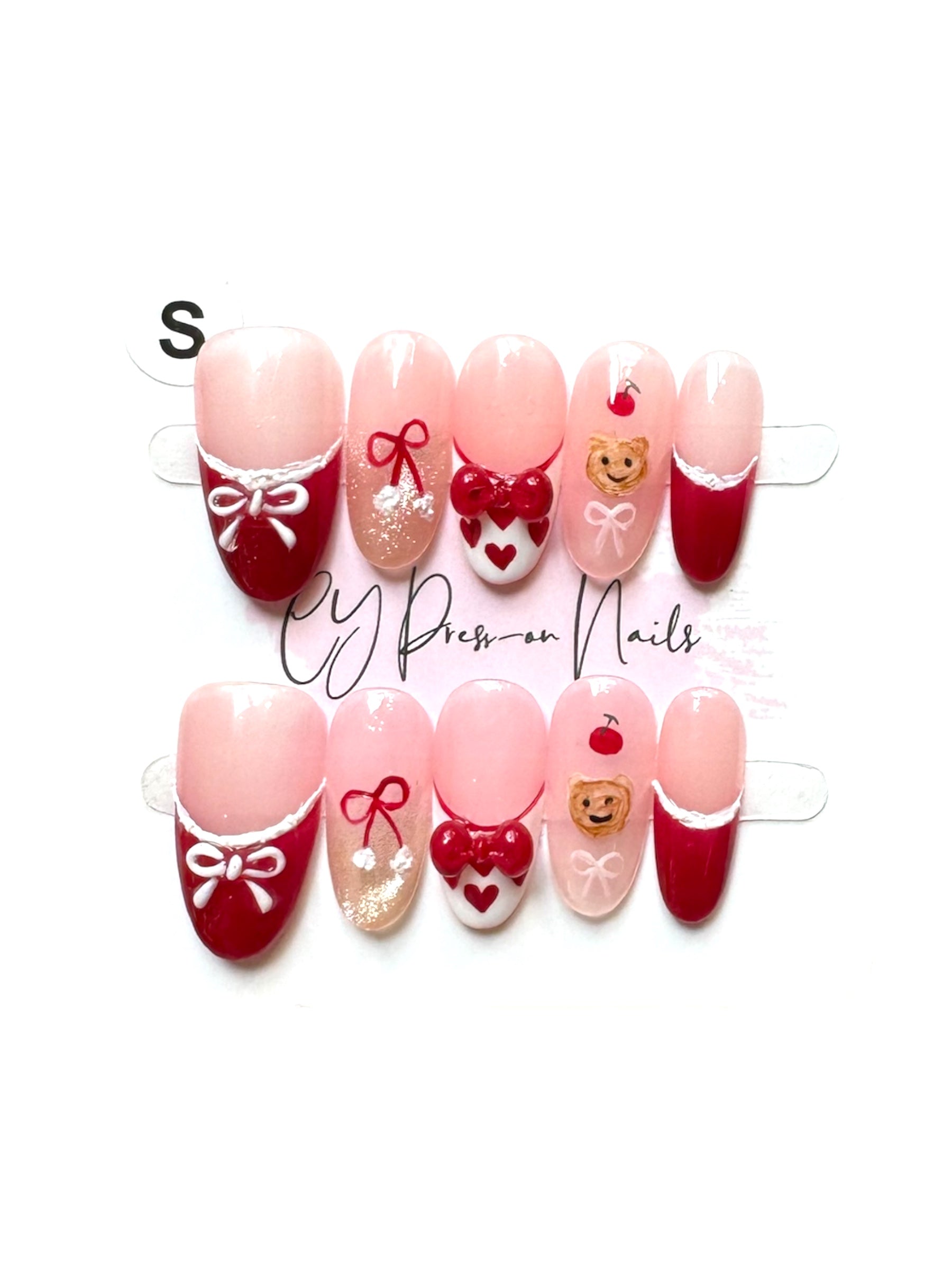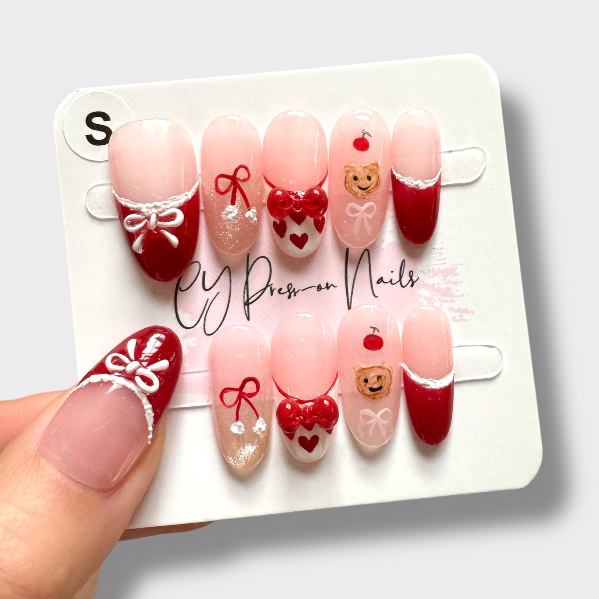 Adorable handmade press-on nails featuring a charming New Year's theme with cherry, teddy bear, and bow accents. This romantic nail set includes deep burgundy, soft pink, and nude shades with white French tips and delicate drip details.