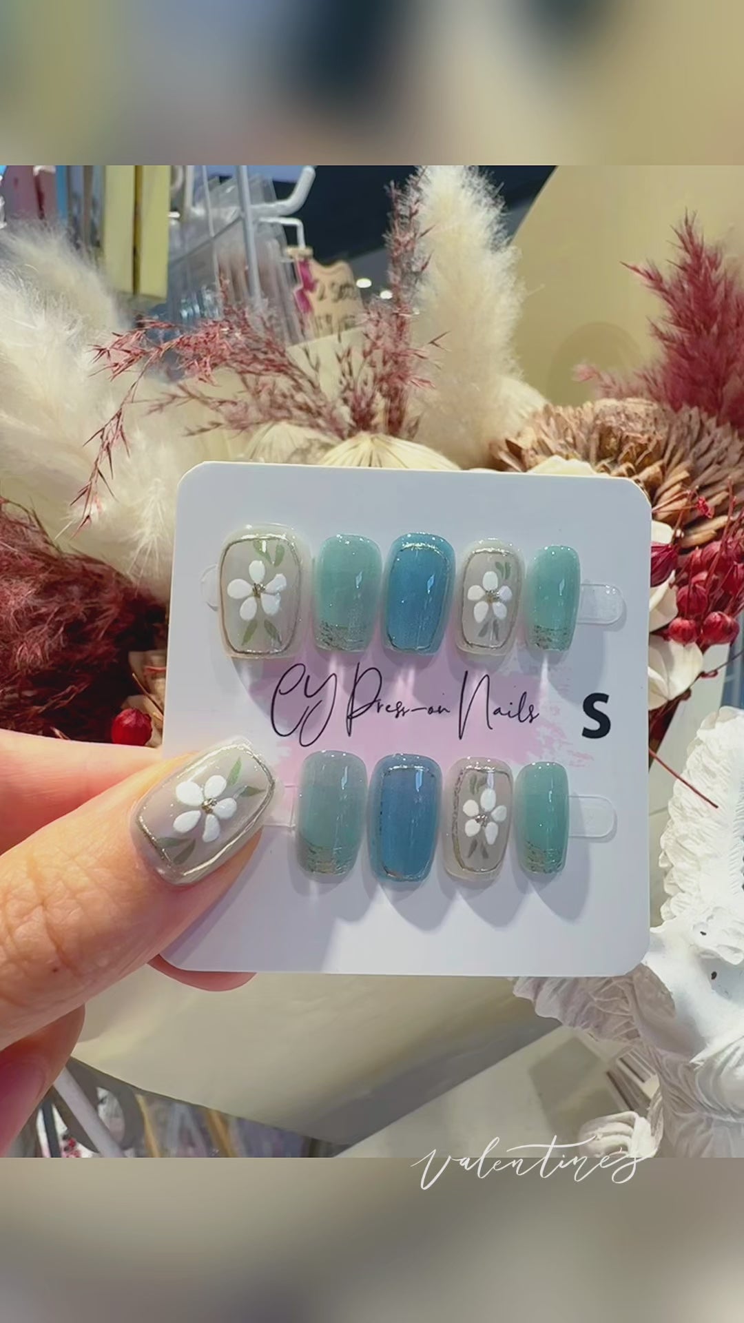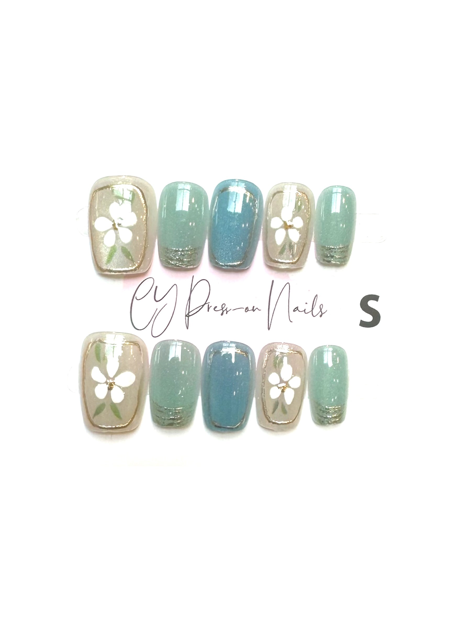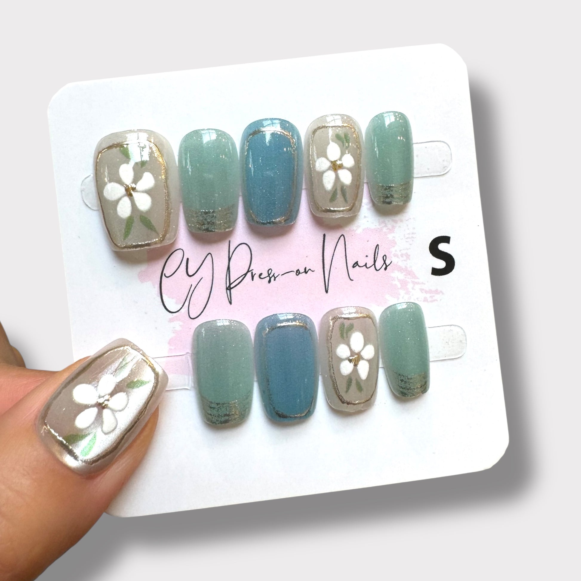 A calming sage and dusty-blue press-on nail set featuring hand-painted white florals framed with soft gold accents. The gradient mix of green and blue adds a fresh, natural vibe—perfect for spring, minimal aesthetics, or anyone who loves soft botanical designs. Handcrafted with a glossy finish for an elegant, everyday look.