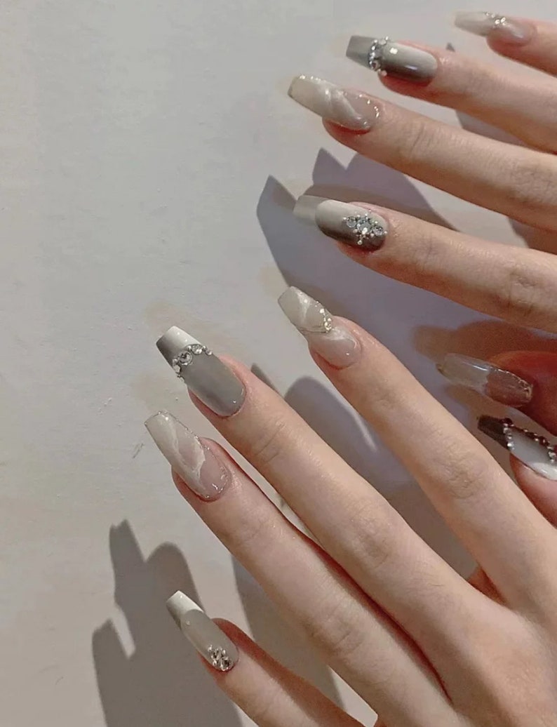Silver Grey Ombre with Crystals French Medium Coffin Handmade Salon-quality Reusable Press-on Nails