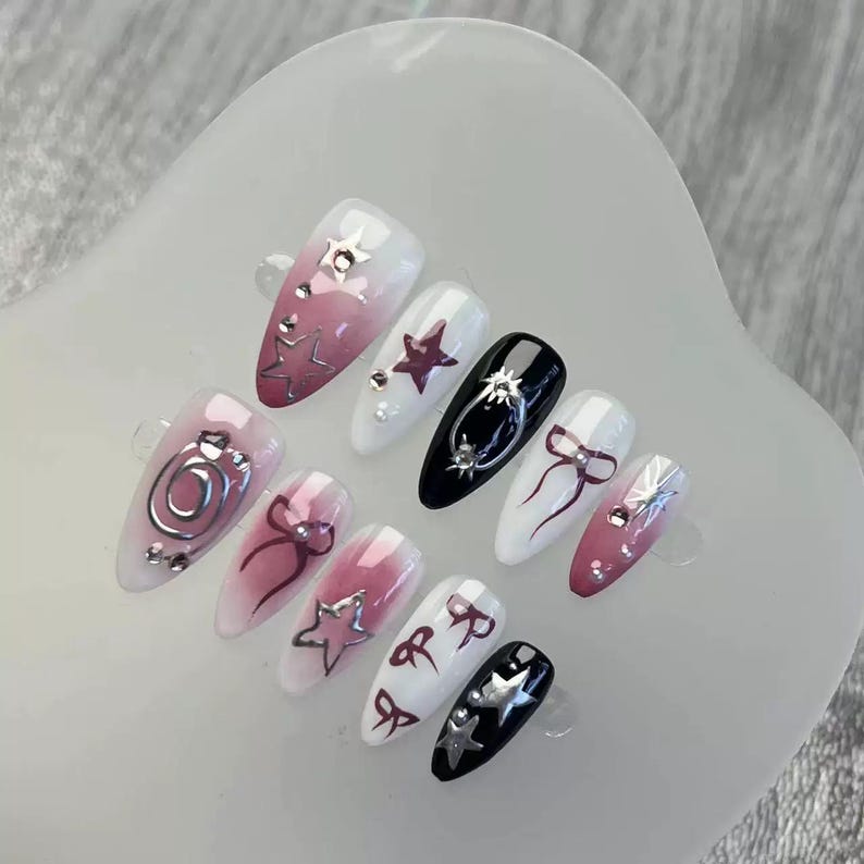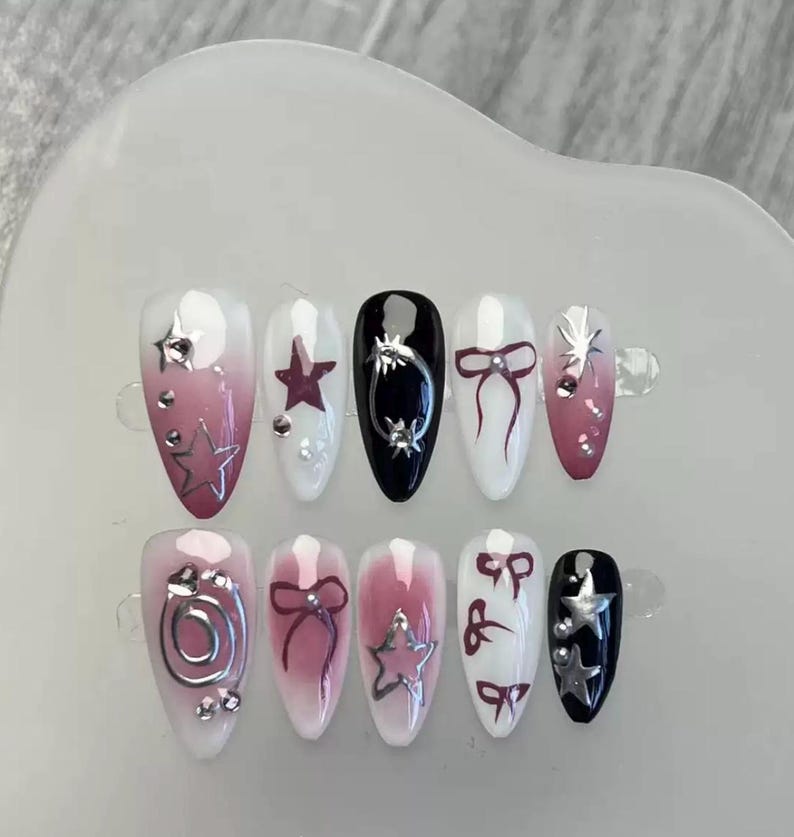 Star Bows Black and Plums Y2k Handpainting Nails Black and Purple