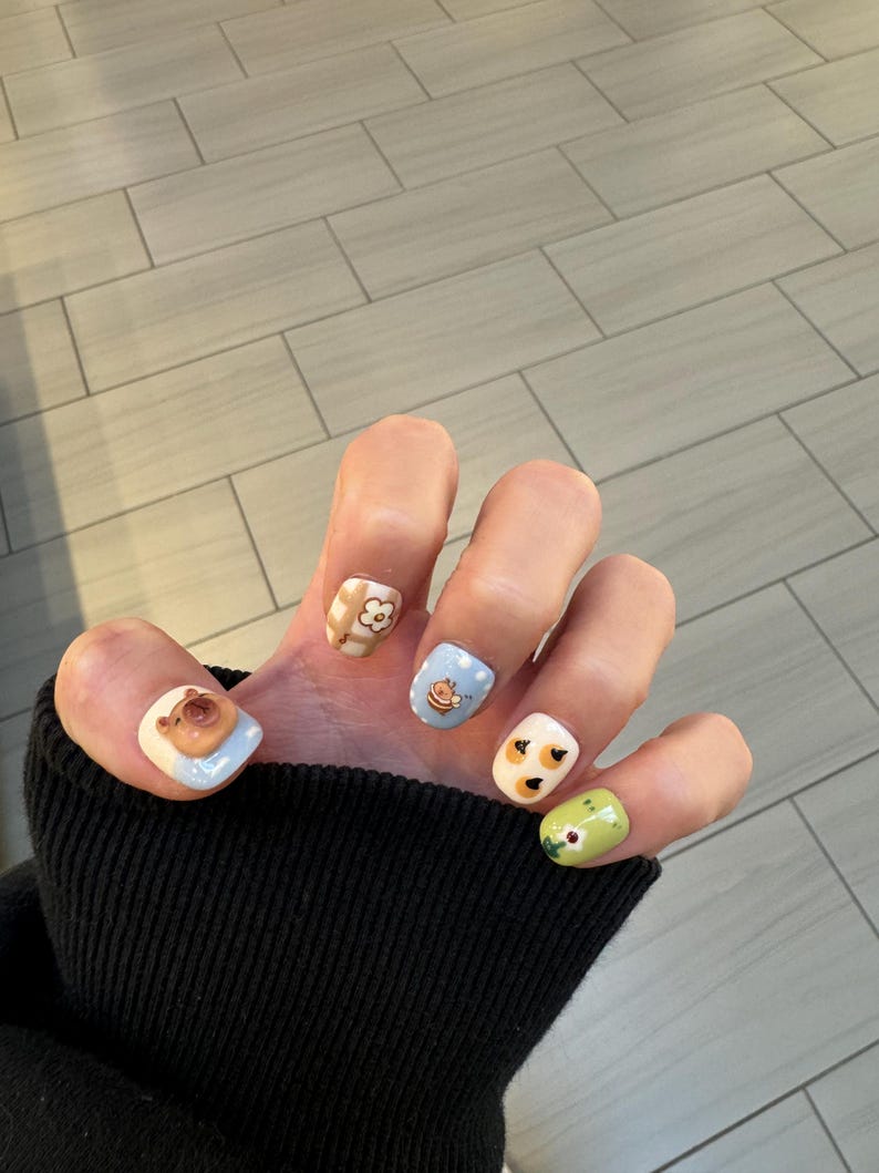 Summer Capybara with the Bees Extra Short Round Cartoon Cute Handpainting Salon-quality Reusable Handmade Press-on Nails
