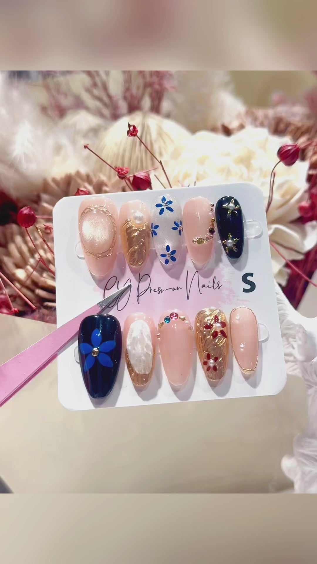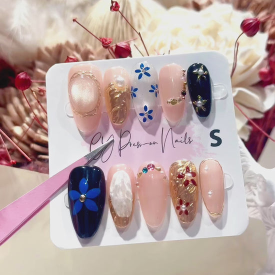 Blue and Gold Floral Press-On Nails with Pearl and Crystal Cat Eye Handpainting 3D Design