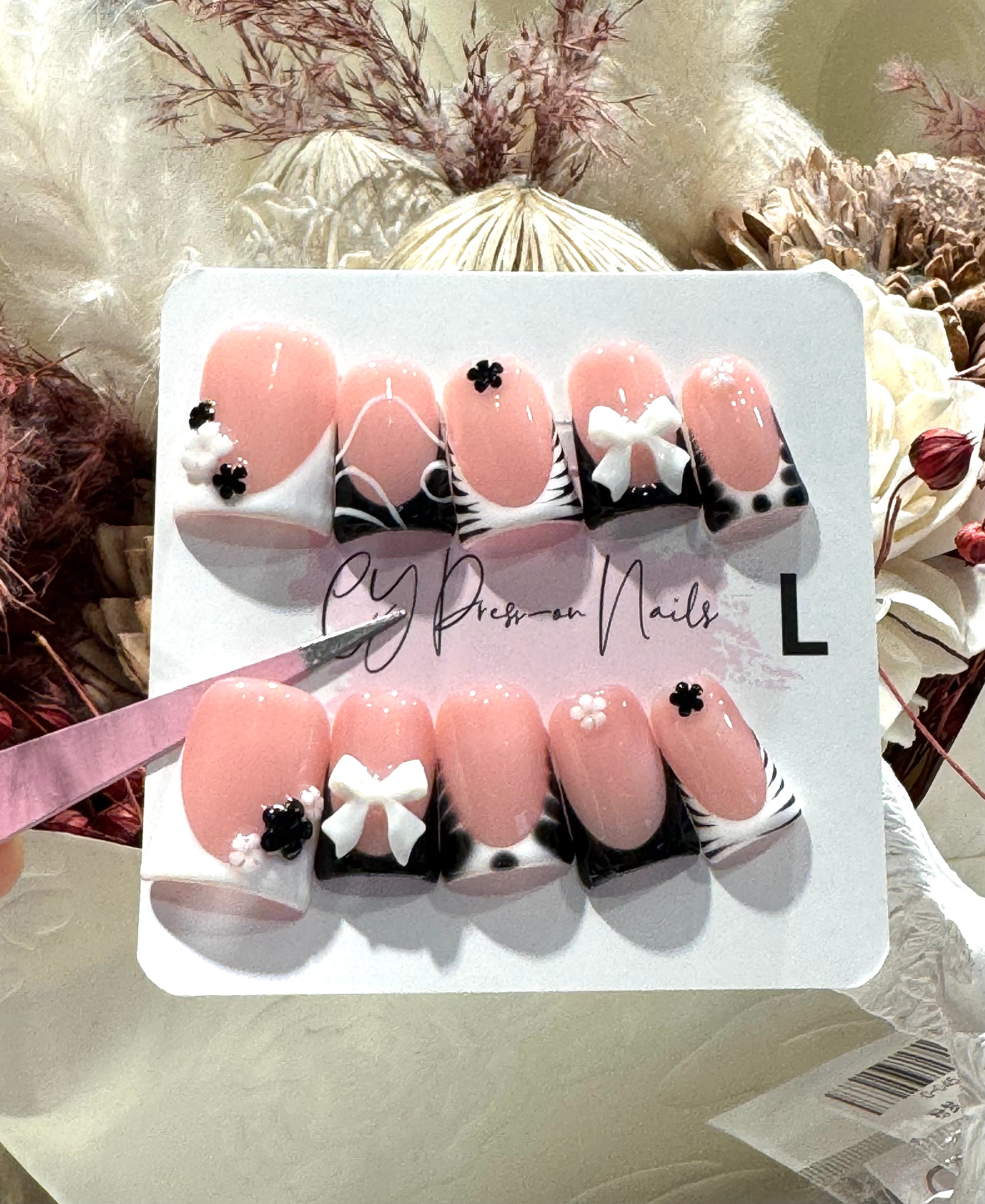 Black and White Style with Bow and Flower 3D Charms in Duck Nails