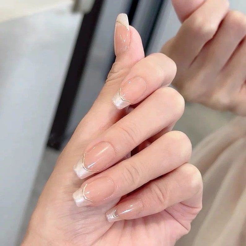 Thread White French Tips Short Coffin Premium Salon-quality Handmade Reusable Press-on Nails with Free Tool Kit