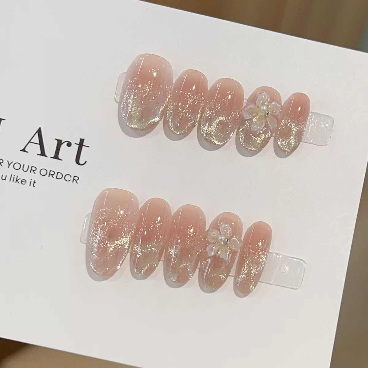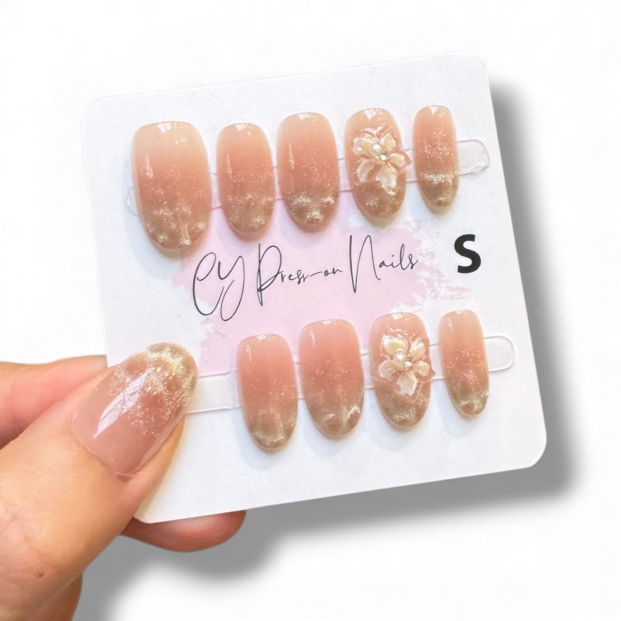 Transform your look with these stunning peach gradient press-on nails featuring shimmering gold leaf accents and delicate 3D floral embellishments. This nail set offers a soft, romantic ombre effect that transitions from peachy nude to warm coral tones, perfect for weddings, special occasions, or everyday elegance.