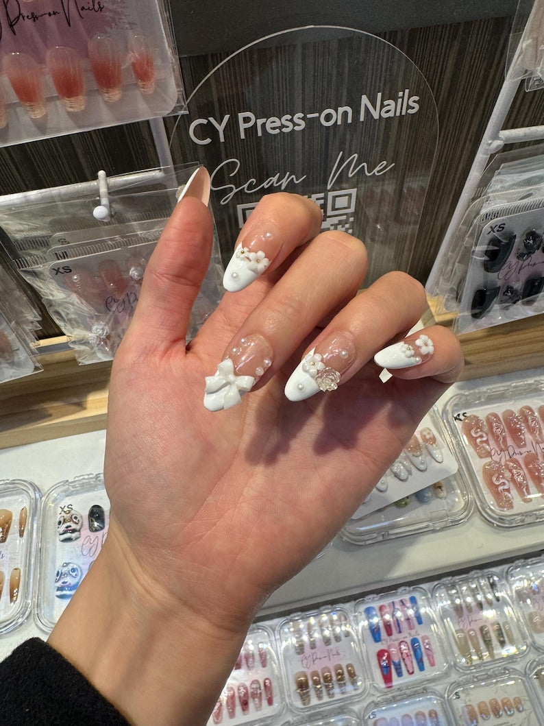 Wedding Anniversary White 3D Flowers with Bows and Pearls Medium Oval Almond Salon-quality Reusable Handmade Press-on Nails