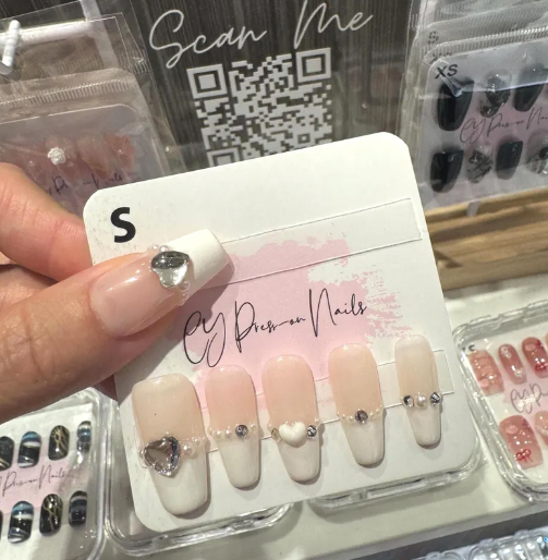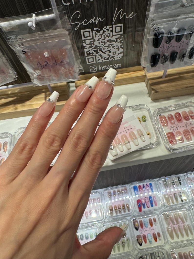 French Tips with Charms Medium Coffin Salon-quality Reusable Handmade Press-on Nails