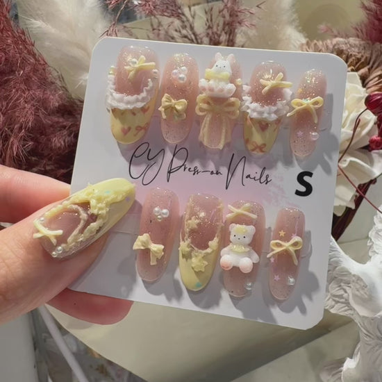 Handmade pink and cream press-on nails inspired by the Jade Rabbit legend. This dreamy set features 3D bunnies, teddy bears, delicate bows, ruffles, pearls, and pastel yellow details over a shimmery blush base. Each nail is handcrafted to capture a sweet, celestial vibe—perfect for anyone who loves kawaii aesthetics, fairycore charm, or Easter-inspired looks. Ideal for special occasions, photo shoots, or everyday cuteness.